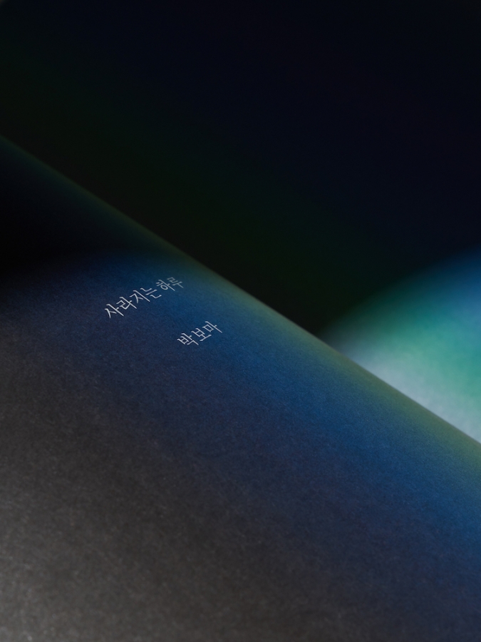 사라지는 하루는 하루라는 시간을 배경으로 삼습니다. 하지만 어디에서도 우리가 익숙히 하루를 이해하는 ‘24’라는 단위는 찾아볼 수 없지요. 오직 시시각각 변화하는 색의 점이 지대만이 있을 뿐입니다. 이 책이 구성하는 하루란, 누군가에 의해 주어진 계량화된 단위가 아니라 미지의 낯선 존재들이 등장하고 사라지는 동안을 의미합니다. 무언가가 등장하고 사라지는 공간으로서의 하루는, 그렇게 무언가가 등장하고 사라짐을 통해서 만들어집니다. 하루가 바로 그러한 것일 때에만 그 다음의 또 다른 미지의 낯선 형태들이 어디가에서 제 모습을 드러낼 수 있을 것입니다. 사라지는 하루를 살펴 보며, 미지의 존재들과 함께 하는 나의 시간을 새로이 만들어 보는 것은 어떨까요?