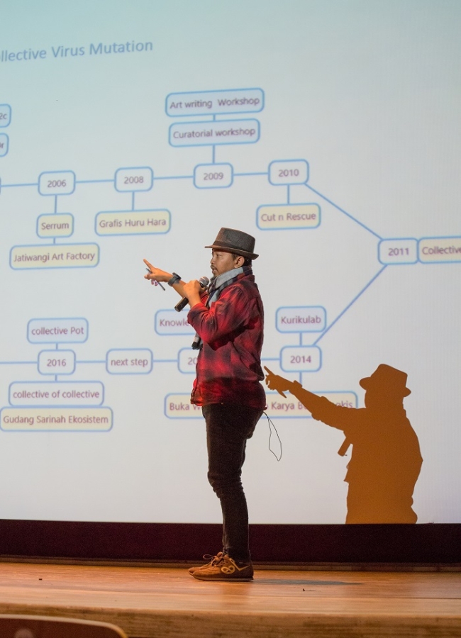 굿스쿨(Gudskul)은 인도네시아 자카르타 기반의 컬렉티브 루앙루파(Ruangrupa), 세럼(Serrum), 그라피스 후라 하라(Grafis Huru Hara)가 협력하여 설립한 배움의 공간이다. 굿스쿨의 주요한 구성 원리인 컬렉티브는 인도네시아의 현대사의 맥락에서 탄생한 주요한 예술 흐름이기도 하다. 특히 이러한 컬렉티브의 움직임은 예술 작품을 생산하는 것에 국한되지 않고 대중들과 함께하는 공공 프로그램 등의 활동을 통해 사회적으로 작동하고자 했으며, 이는 대안적인 것에 대한 요청이 아니라 그 스스로가 생태계를 구성할 필요성에 따른 것이었다. 수 년간의 과도기를 거쳐 2018년 설립된 ‘굿스쿨: 동시대 미술 컬렉티브 연구 및 생태계’는 자기 자신의 지역에서 요청되는 예술 실천과 교육을 수행하는 플랫폼이다. 굿스쿨은 이번 발표에서 그들이 농크롱(nongkrong)이라고 부르는 함께하기의 형태가 어떻게 배움의 장소가 되고 새로운 생태계를 형성하는 교점이 되는지 질문하고, 나아가 그것이 어떻게 지속할 수 있을지를 고민한다.