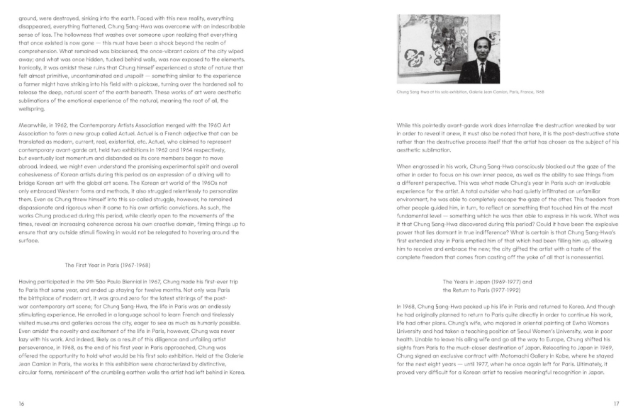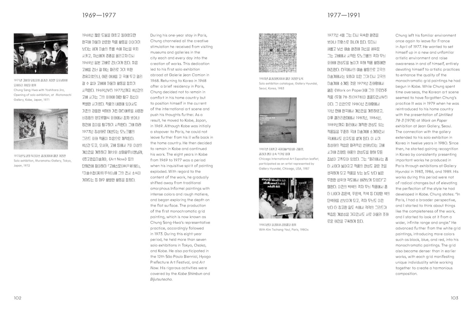 1960년대, 전위적이고 저항적인 미술 실험에 적극 동참한 정상화는 오랜 기간 일본과 프랑스에서 활동하며 현대미술 최전선에서 벌어지는 움직임을 직접 경험했다. 1970년대 이후에는 작가의 작업세계가 집약적으로 농축된 백색의 기하학적 추상이 화면 위에 나타난다. 이 전시에서는 정상화의 작품세계와 아그네스 마틴과의 미학적 관계를 탐구하기 위해 가장 절제되고 정제된 백색주상의 대표작들을 선별하여 소개한다.