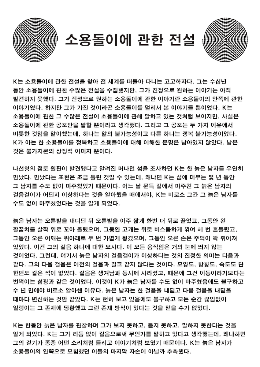소용돌이는 아주 오래된 과거부터 지금에 이르기까지 불가지론의 주요한 상징이다. 소용돌이는 땅, 바다, 하늘 어디에서나 출몰하지만 어디에도 속하지 않은 공간이며, 그 공간은 아직 인간이 유일하게 탐험하지 못한 영역이다. 전해지는 수많은 이야기 속 용감한 영웅들 마저도 소용돌이를 피해가고, 우리에게 전해지는 것은 그저 먼 곳에서의 목격담 뿐이다. 허깨비처럼 나타났다 사라지는 소용돌이는 어떤 공간일까? 거기에서 힘은 어떻게 흐르고 있을까? 소용돌이에 관한 전설은 소용돌이에 관해 사변해보는 일이다. 전설은 새로 쓰일 것이고, 소리가 그것을 추적할 것이다.