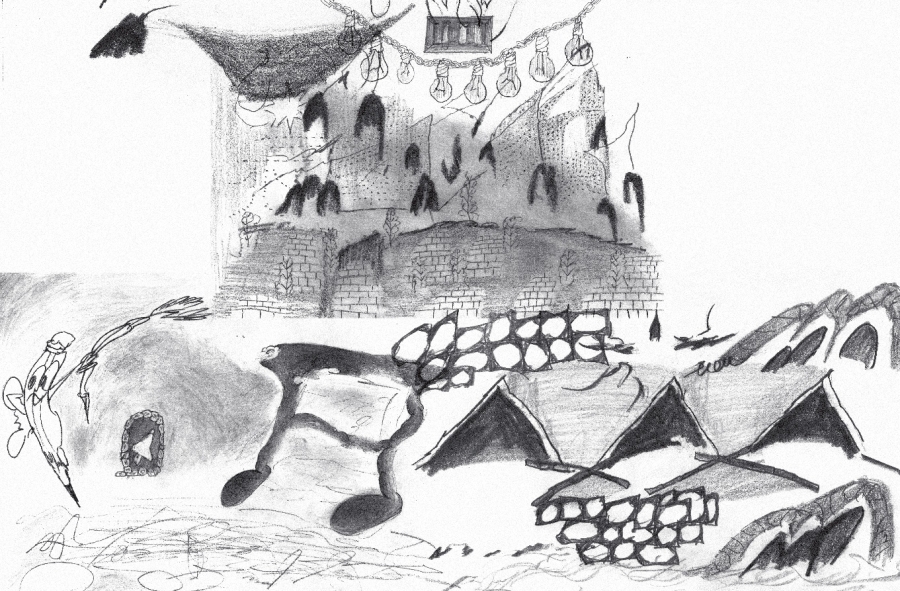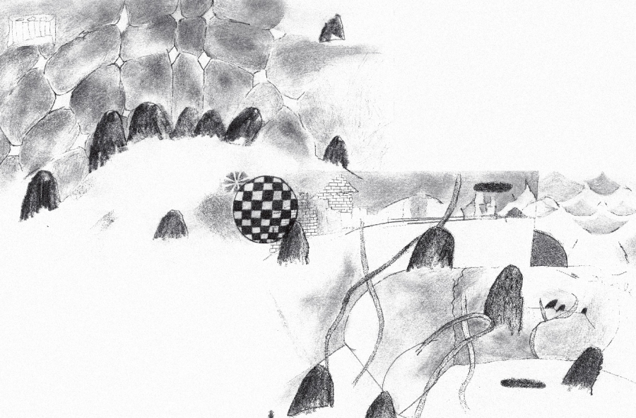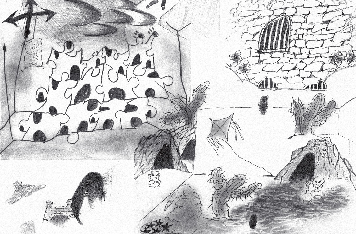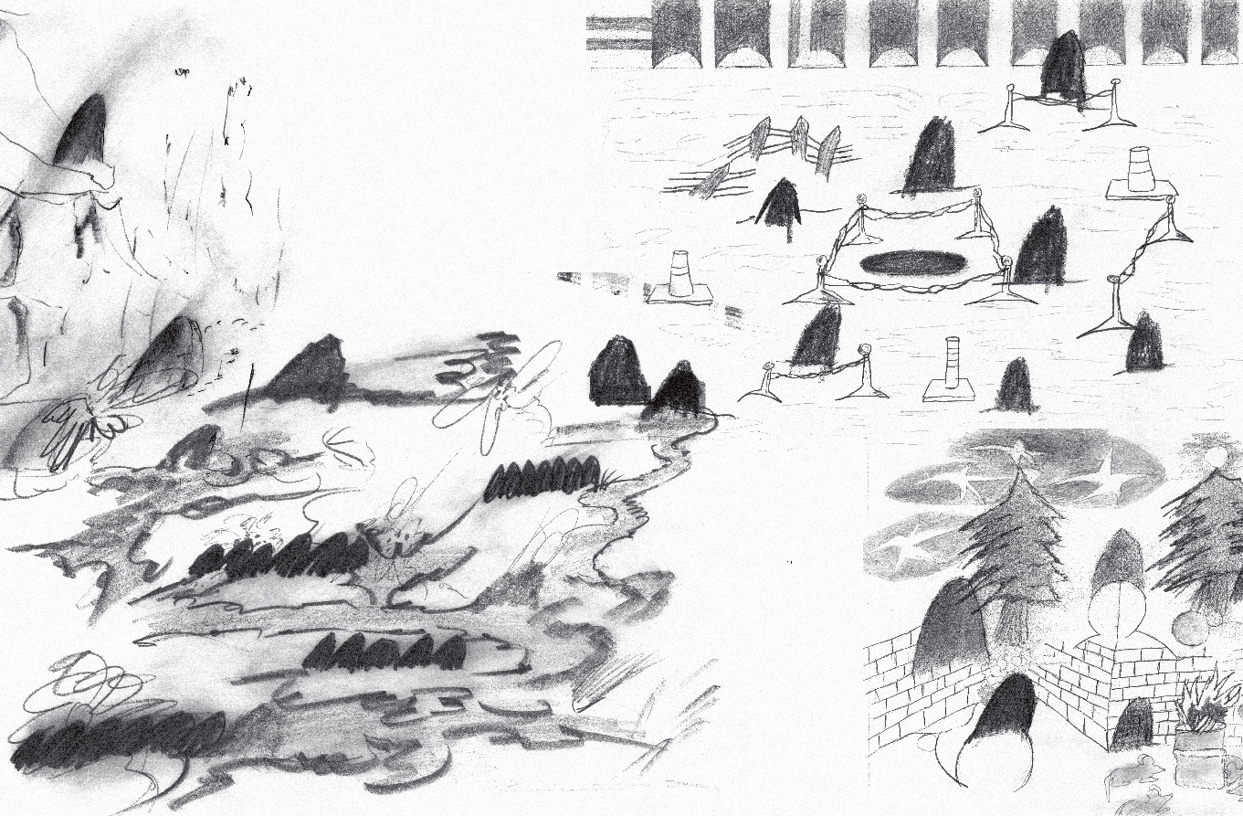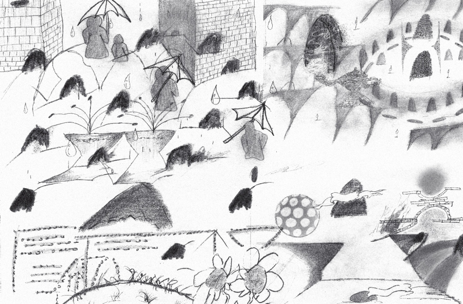 도시의 골목들, 울타리 쳐진 들판, 절벽, 구석진 담벼락, 어디로 통하는지 알 수 없는 수많은 동굴과 구멍과 문을 건너며 번쩍이는 미러볼, 뭉개진 로드콘, 모닥불에 모여든 생쥐들, 우비 쓴 사람들, 불 꺼진 전구, 깡총깡총 뛰어가는 연필, 노래 부르는 주사위, 뜯어진 철망, 풀 죽은 강아지와 긴장한 고양이, 목 묶인 눈사람, 웃는 해골과 풍선같은 선인장, 날아다니는 돈다발, 흔들리는 꽃들과 마주치고 끊이지 않는 폭발음과 소음과 음악과 웅성거림을 듣는 모험의 그림 동화.