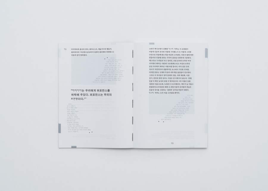 하지만 우리는 더 흥미롭고도 강력한 방식으로 이 매체가 작동하는 것을 살펴보고자 한다. 한 장면에서 발생한 특정 행위는 우리의 눈앞에서 사라졌을 뿐이다. 우리는 퍼포먼스를 반복적으로 재연되고 재작동하는, 현재 진행형의 몸짓과 행동의 레퍼토리라고 여길 수 있다. 그 몸짓과 행동을 쉽게 알아차리기 어렵지만 말이다. 수행되고 체현된 실천을 통해 우리가 배우고 대화할 수 있는 이유는 행위 그 자체가 반복을 거듭하기 때문이다. 움직임과 리듬이 바뀌어도 우리는 춤을 춤으로 인식한다. 퍼포먼스는 과거, 현재, 미래에 관한 것이다.