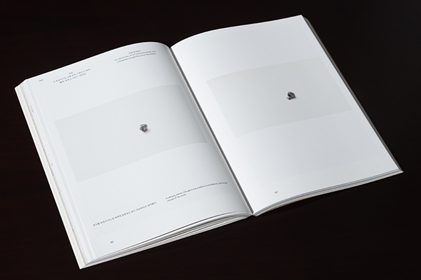 • 정서영: 공기를 두드려서 전시장에 들어갔을 때, 방향을 알수 없는 곳에서 들려오는 전자음이 계속해서 거슬렸다. 1층 전시장을 관람하는 내내 그 소리가 미세한 진동으로 따라다녔다. 전시장 2층 가장 안쪽 방에 들어갔을 때 거기에는 세계라는 제목의 두 채널 영상이 루핑되고 있었고 소리는 거기서부터 시작되었음을 알게 됐다. 화면 속 호두는 미동도 없이 가만히 있었지만 그것을 둘러싼 모든 조건은 호두를 단 한순간도 가만히 있는 것으로 두지 않았다. 사물은/세계는 끊임없이 흐르고 흐름의 총체로서 이해되며 세계는 흐름 자체인 진동과 흐름을 추동하는 진동에 대한 이야기라고 생각했고 나는 그것에 빨아당겨지듯 몰두할수밖에 없었다. 도록이 전시를 특정한 형식으로 경험을 재생산하는 일이라면, 나는 이 작품이 책의 가장 가운데에 자리하는 것이 이번 전시를 재생산하는 가장 합당한 선택이라고 생각했다. 책의 정가운데란 코덱스(codex) 형식의 책에 있어서 모든 순차를 고려할 때 가장 깊숙한 장소이다. 그곳에 도달한다는 의미는 책의 첫 장에서 진입해 마지막 장까지 돌아 나오며 책 ‘전체’를 경유해야 한다는 것을 뜻한다. 동시에, 전체를 거치지 않고도 단 한번의 펼침으로도 도달할 수 있는 깊숙한 장소다. 책의 정가운데에서 생각한다면, 책이란 것은 동심원 형태로 퍼져 나가는 것이 된다. 이러한 원리에 따라 책의 구조를 결정했고 세계에서 시작하여 작품들 사이의 자연스러운 배치를 찾아 나갔다. 작품들 사이의 연결은 수없이 많은 조정의 과정을 거치며 흐름을 다독이는 일이다.