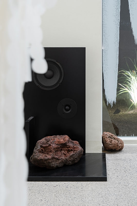 A 제주에 가기 전 제주의 민담을 엮은 책에서 오돌또기라는 이야기를 읽었습니다. 오늘날의 오키나와와 베트남까지 이르는 해양 국가들을 배경으로 한 김복수라는 인물과 그의 가족들의 삶에 관한 이야기였습니다. 이 이야기는 제주가 드넓은 바다 너머의 외부와의 관계 속에서 만들어져 왔음을 생각하게 했습니다. 차를 타고 제주를 다니던 중 실수로 AM 라디오를 켜게 되었습니다. 그런데 노이즈와 맥놀이가 뒤섞인 소리 너머로 낯선 언어의 말소리가 들렸습니다. 가만히 집중해서 들어보니 일본 말이었습니다. 눈에 보이지 않지만 제주의 대기 속에서 진동하고 있는 외부의 소리들이었던 것이죠. 주파수를 이리저리 돌려가며 여러 머나먼 외부의 소리들을 듣고 녹음했습니다. 이 소리들 중 두 개를 선택해 전시장에 beyond the land 954, beyond the lands 855라는 제목으로 설치했습니다. 둘 모두 초지향성 스피커를 사용했고 전시장 양 끝에서 놓아 두고 소리가 안쪽으로 향하도록 했습니다. 전시장을 가득 채운 제주도의 여러 소리들 사이로 이 외부의 소리들이 은밀히 그러나 의미심장하게 들리기를 바랐습니다.