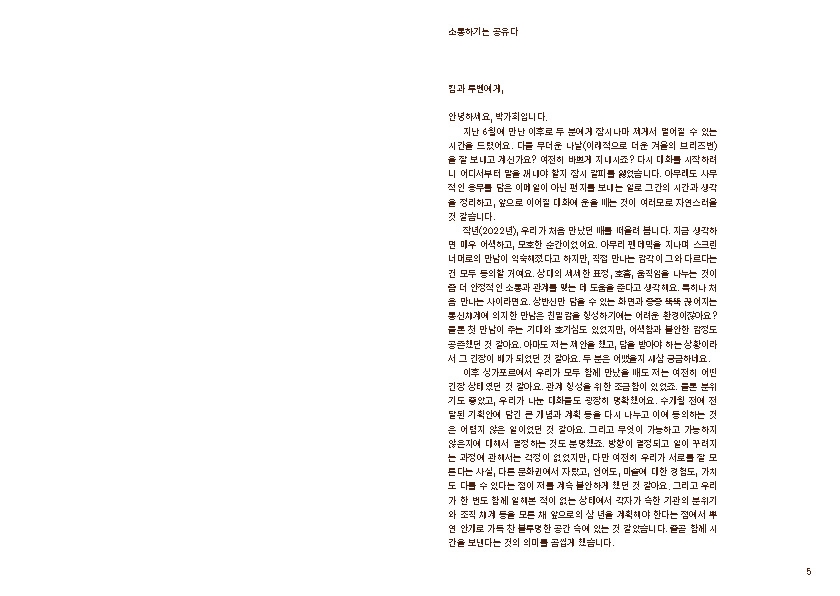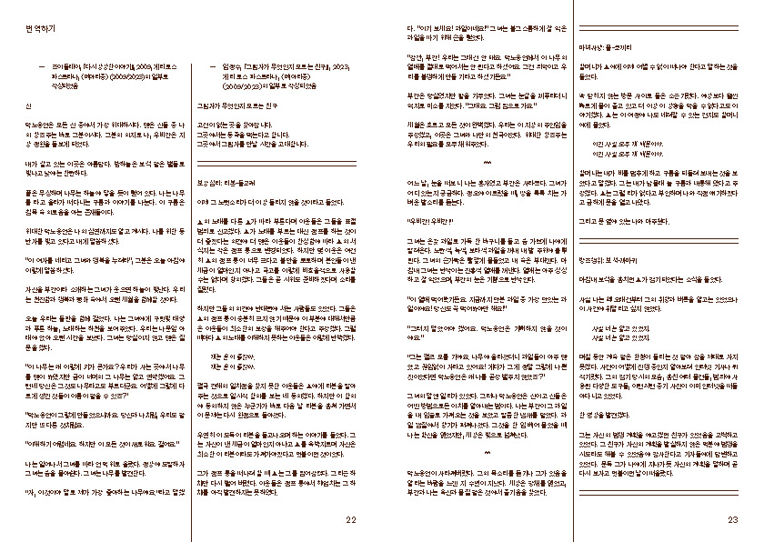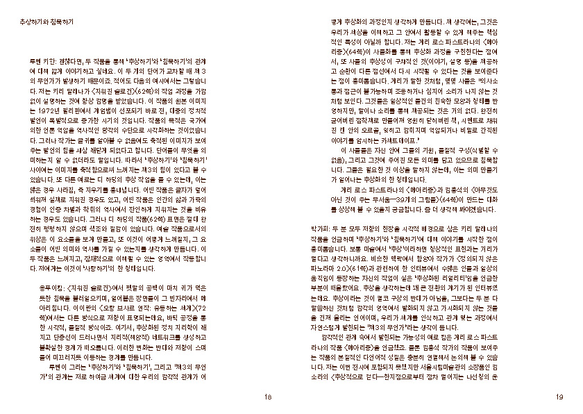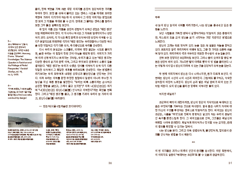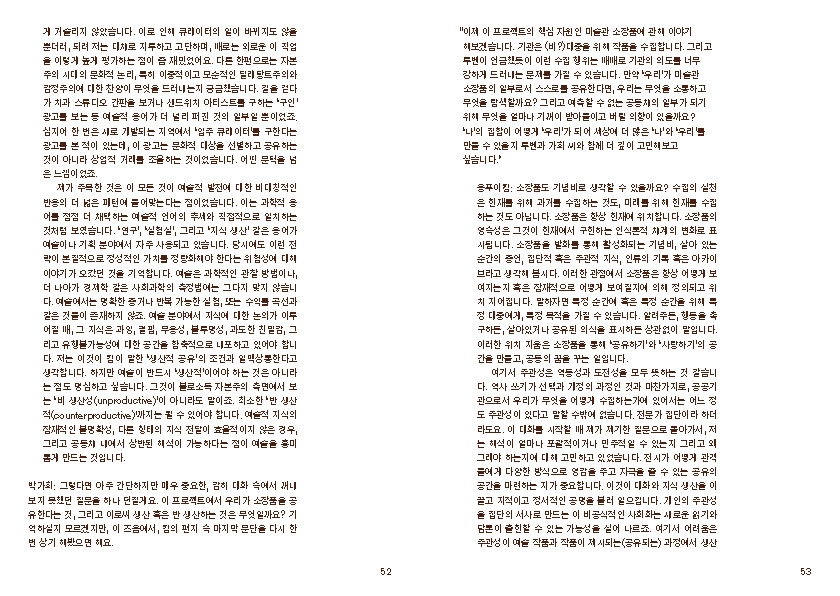 우리가 모여 산을 이루는 이야기 실천어 해설집은 전시를 만드는 과정에서 생산된 말과 글입니다. 수개월에 걸쳐 지속된 대화는 우리가 (미술관에서) ‘공유’를 실천하고자 할 때 수반해야 할 일련의 행위들을 10여 개의 실천어로, 또 이를 이해하고 행하는 도구로서의 소장품을 군집으로 제안합니다. 연쇄하는 실천어와 군집을 이루는 작품들을 경유한 대화는 전시 속에서 특정한 장면과 교점이 되어 앞으로 이어질 실천을 촉매합니다. 서로 다른 언어, 문화, 감각의 차이를 전제하는 산 경험과 상황적 지식이 교차하는 대화는 공통의 사유를 찾아나간 결과로 얻은 앎의 조각들입니다. 이에 우리의 언어 속에는 (의도적인) 오독, 놀라움, 일종의 주장, 차이와 공통의 이해 등을 포함하고 있습니다. 이 대화가 관객 여러분들과 만나며 더 많은 앎의 조각과 경험을 교차시키고, 확장하는 의미와 관계망을 그려낼 수 있기를 기대합니다.