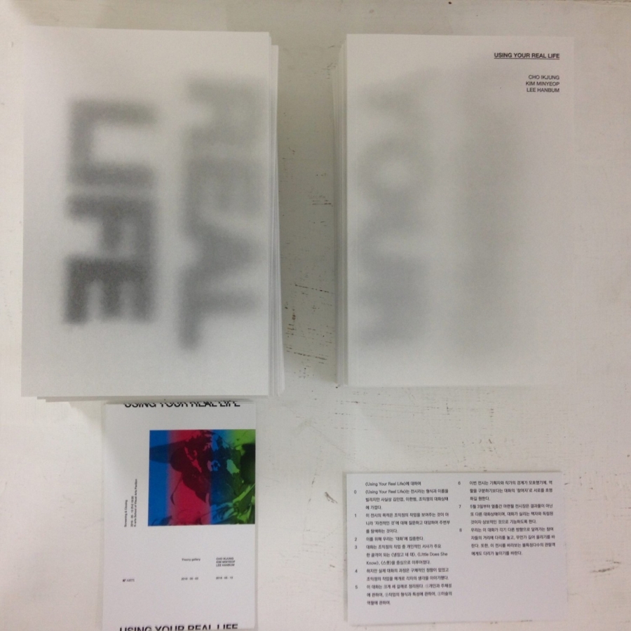 Using Your Real Life의 전시장과 책자는 독립된 것이자 상보적인 것으로 기능하도록 기획하였다. 책자가 이한범, 김민엽, 조익정의 대화였다면 전시장은 그 대화가 불특정다수에게 분산되는 공간일 것이다. 그러나 대화와 마찬가지로 전시장은 느슨하게 맥락화 된다. 이번 전시는 결과물이 아니라 과정일 뿐이기에 관람객에게 어떠한 강요도 하지 않기를 바라며, 참여자들은 단지 최소한의 질문만을 던져 놓을 것이다. 이를 어떻게 구성할 지는 결국 또 다른 삶에게 이양된다.