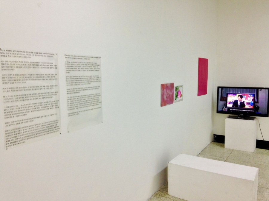 학교에 입학하고 졸업할 때까지 복도를 오가며 수많은 전시를 보았다. 주제나 기획의 방향을 떠나서, 노트북과 책과 필기구와 담요를 바리바리 싸들고 바삐 움직이는 발걸음을 멈춰 세우게 만들었던 이런 저런 작업은 대부분 벽에 단정하게 걸려 있는 작은 드로잉이나 회화, 사진과 같은 평면작업이었다. 방형(方形)을 중심에 두기는 하지만 길고 긴 회랑을 따르는 움직임의 관성은 동선을 이미 어느 정도 결정하는데, 이리 저리 ‘배회하는 곳’이 아니라 ‘지나가는 곳’인 복도에서 오브제는 기이할 정도로 힘을 잃어버렸다. 또한 몸을 운신할 수 있는(시선이 가질 수 있는) 너비가 그리 넓지 않기 때문에, 형(形)이 강한 힘을 지니는 작업보단 가까이서 조곤조곤 살펴볼 수 있는 작업들이 언제나 기억에 남았다.