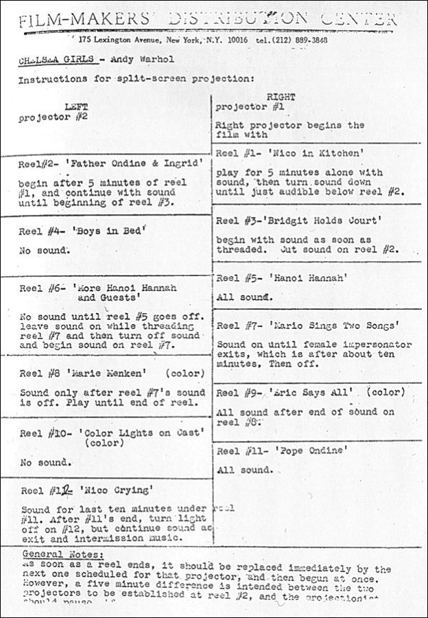 첼시의 소녀들에 대해 영화적인 독특함을 얘기할 때 가장 회자되는 것이 투채널 프로젝션입니다. 투채널로 프로젝션 하기로 한 것의 가장 첫 이유는 이 영화의 독특하고 서사적인 측면이 이해하기 쉽다는 것 때문이었습니다. 사운드는 한번에 하나의 화면의 것만 재생되어 소리와 화면간의 불일치가 생겨납니다. 또한 두 개의 프로젝터는 정확한 지시문이 있었지만 절대로 정확한 동기화를 이루지 못했기에 매번의 관람은 다른 작품을 보는 것일 수밖에 없었습니다. 이 영화는 대본이랄 게 없는데다가 등장인물들이 대체로 약에 취해 있기 때문에 이들이 하는 말은 영어 원어민이라도 제대로 알아들을 수 없습니다. 워홀을 제외한 모두가 약에 취해 있었기에, 대사가 있는지, 그걸 잊어버렸는지, 제대로 말하는지 아무도 잘 몰랐습니다. 동시에 두 화면이 나오고 그중 하나의 사운드만 나오는 듀얼 스크린은 관객또한 마찬가지로 이러한 상태로 남겨둡니다.