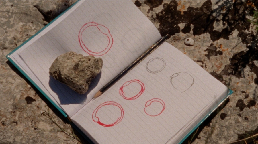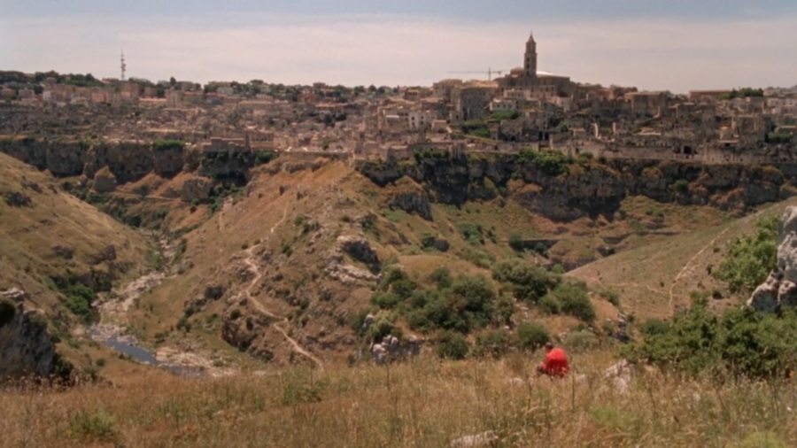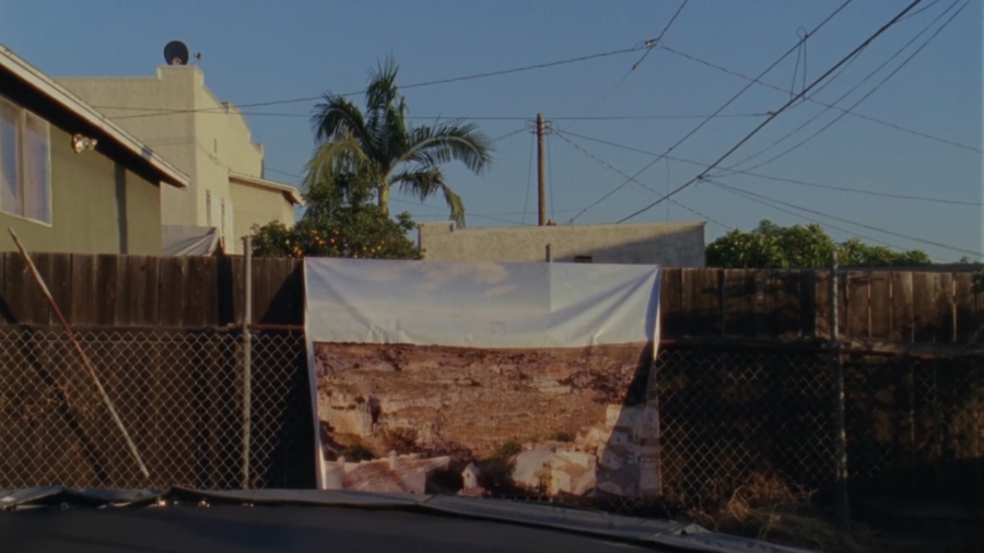 알샤리프가 이 작품에서 다루고자 하는 대상은 명확하다. 바로 가자 지구라고 하는 상황이다. 그는 가자에 대한 다른 보여주기를 시도하고, 그것을 표면적인 이미지의 소비로부터 해방시켜 다른 장소들의 시공간과 연결시킴으로써 ‘이미지의 고립’에서 벗어나고자 한다. “시간은 시간으로부터 벗어나고, 장소는 반복해서 상실된다”라는 냇 뮐러의 묘사는 정확하다.10 때문에 이 작품에 대한 질문의 시작은 아마도 가자라고 하는 상황을 어떻게 재현하고 있는지가 될 것이다. 우로보로스는 가자와 로스앤젤레스의 한 마을, 캘리포니아의 모하비 사막, 이탈리아의 마테라, 프랑스 브르타뉴 지역의 성을 오간다. 하지만 우리는 영화 안에서 그 풍경이 어떤 시간에 속해 있는지, 어떤 장소인지를 확인할 길은 없다. 단지 영화라고 하는 공간 안에 배치되어 서로 간의 상호성을 가질 뿐이다.11 한 풍경 안에는 여러 인물들이 등장하는 하나의 이야기가 있고, 이런저런 장치를 통해 풍경은 이어지고, 겹쳐지고, 반복된다. 마테라의 풍경 속에 있던 주인공이 로스앤젤레스의 한 마을에 등장했을 때, 담벼락에 걸려 있는 마테라의 풍경 현수막을 가만히 보다가 지나쳐 가는 것처럼 말이다.