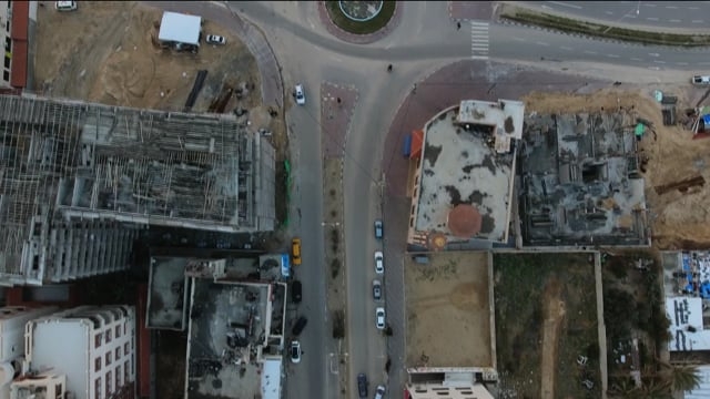 우로보로스의 첫 장면은 드론으로 촬영한 해안가의 풍경이다. 수직으로 내려다본 해안에는 파도가 밀려온다. 아니, 밀려나간다고 표현해야 정확할 텐데, 영상은 이 풍경을 거꾸로 재생시키고 있기 때문이다. 드론은 천천히 해안 도시 안쪽으로 이동하며 도로 위에서 움직이는 차들, 학교처럼 보이는 건물의 운동장에 모여 움직이는 사람들과 같은 도시의 미시적인 움직임들을 마치 감시자와 같은 시선으로 포획하고, 드문드문 부서지고 타버린 건물들을 무심히 스쳐 보여준다. 이 시퀀스 내내 위기감을 고조시키는 허디거디(hurdy-gurdy)의 사운드가 귀에 거슬릴 정도로 강하게 이어진다. 그리고 갑자기 전환되는 장면은 평화롭고 아름다운 해안 도시의 풍경을 천천히 조망한다. 갑자기 왜 다른 도시를 보여줄까 싶지만, 문득 한 건물에 적혀 있는 ‘Bank of Palestine’이라는 문구가 보이고 이곳이 시점만 바꿔 촬영된 가자 지구임을 상기시킨다. 우리가 미디어를 통해 기억하는 가자의 이미지는 재난과 폭력, 절망과 슬픔만이 가득한 도시이지만, 중년의 아랍 여인이 햇살 가득한 정원을 가로질러 들어간 드넓은 가정집은 삶의 시간이 고스란히 남아 있는 부유한 생활을 드러낸다. 카메라는 모든 방을 하나하나 들어가 침구류며 책꽂이, 장식품 등을 손으로 건드리는 여인의 뒷모습을 따라가는데, 이 롱테이크 시퀀스는 해안의 풍경과 마찬가지로 거꾸로 재생된다. 거꾸로 재생되는 시퀀스는 사막에서 텐트를 짓는(해체하는) 네 남녀의 모습이나 마테라의 집 안에서 음식을 준비해서 먹는 주인공의 모습 등 영화 곳곳에서 등장한다. 이는 서사가 선형적 시간의 연속체로서 구조화되는 것을 거부하며 한 단위의 공간이 다른 단위와 임의적으로 연결될 수 있음을 알린다.