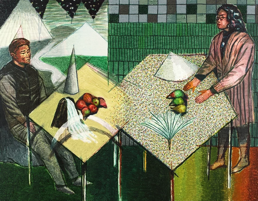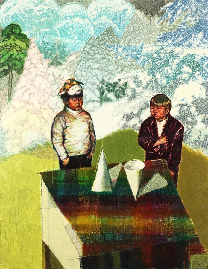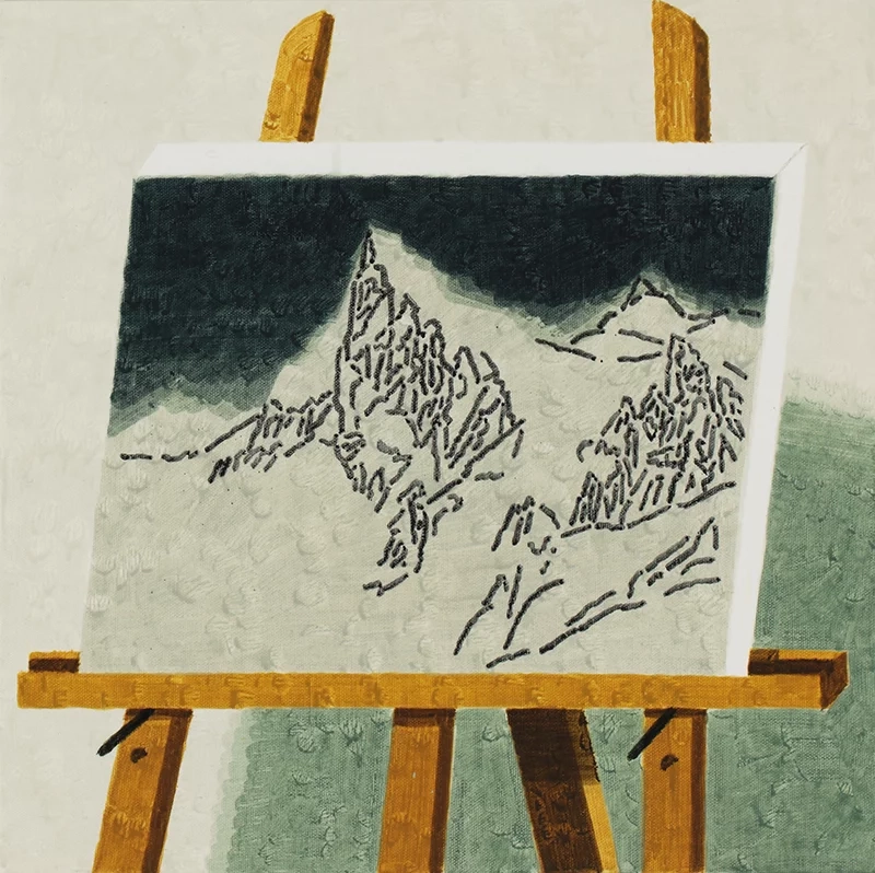 What is as interesting as the arena of signification in Jeon’s painting is that the artist establishes the acute conditions for the problems of the two in her paintings. In works that suggest contingency, subjectivity, and the impossibility of dialogue such as Horn and Conversations (2014) and Similar and Different Way of Speaking (2014), there is always a table (that is almost two-dimensional) between the two protagonists. Around this table, these two exchange uncoordinated gestures and expressions. In Misconception on the Table (2015), there is even a ping-pong table, but there is no sign of the game taking place while the protagonists are absorbed in their own games. At the table made for discussions and games only lies a line of incommensurable objects. In a similar vein, Moment of a Painting (2016) fits a tall and large pedestal that gives equal status to both forms. As suggested by the candid title, the mysteries of the two here are always pictorial in that they are bounded by the limits of the canvas. There is no attempt to conceal its painterly nature. Instead it is emphasized. A more intricate interpretation of this composition would come from Jeon’s understanding that the mystery of the two does not arise by simply being together. An Empty Paper (2017), Mountain on a Paper (2017), and Mountain Painting (2017) more directly distinguish the painting itself from the smaller pictorial spaces. While allocating spaces for the relationships between objects, the painting itself is also construed as an object so that it not be forgotten that the painting itself becomes one of the “two.” This conceptualization allows for the artwork to also become (by coming out of the safe zone) one of the two that constitute the Truth. This was initially shown in her solo exhibition Black Green Leaves (2018): the paintings that are composed solely of the relationship between pure geometric figures without objects to emphasize the materialist aspects of painting. The empty space of the canvas itself is all the pictorial space that these flat figures need. But it also seems this closure is one that too easily mulls over the truth of life. Dry tension erodes the mystery of the two and emphasizes only the form and matter in empty silence.
