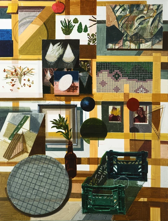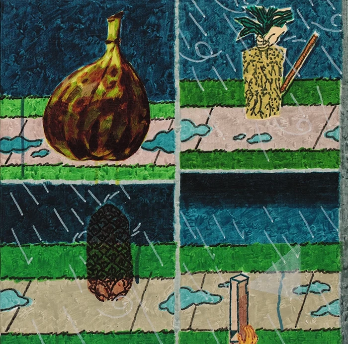 Since 2016, Jeon has been working on putting small squares on the screen like sticking on post-it notes. In reference to Objects, Drawings and the Cone (2016), one can see that such memos are a kind of “record.” Similar to Notes, the painting Objects, Drawings and the Cone is packed with memo-pictures, figures, and objects on a grid that appears to be the back of a canvas. Such a composition is reminiscent of a Wunderkammer, or a cabinet of curiosities. Giorgio Agamben describes this cabinet of curiosities as where “chaos seems to reign, but [where] chaos is nothing more than a premature impression,” or “a sort of microcosm that reproduced, in its harmonious confusion, the animal, vegetable, and mineral macrocosm.” He further underscores the principle of harmony: “the individual objects seem to find their meaning only side by side with others.”4 Records, and memo-pictures as their container, are given a status equal to that of the objects and horns in Jeon’s paintings. It is also the records and memo-pictures that form relationships with the objects. Here, once again, I contemplate Jeon’s position on the relationship between objects. Similar to how she questions the objects themselves, her records might not be about some self-explanatory memories but about a moment that is inscrutable yet present. As with objects, that moment delays judgement and reproduces the truth of life and pictorial reality through the very relationships among the objects. From the point of view of the mystery of the two, this moment is a low resolution image, unlike a form or object. In Parallel Paths-Day and Night (2017), large, small, lucid, and opaque memories fill up the canvas with other objects, landscapes, and cones. The vibrant and faint, the meaningful and trivial share the same rhythm.
