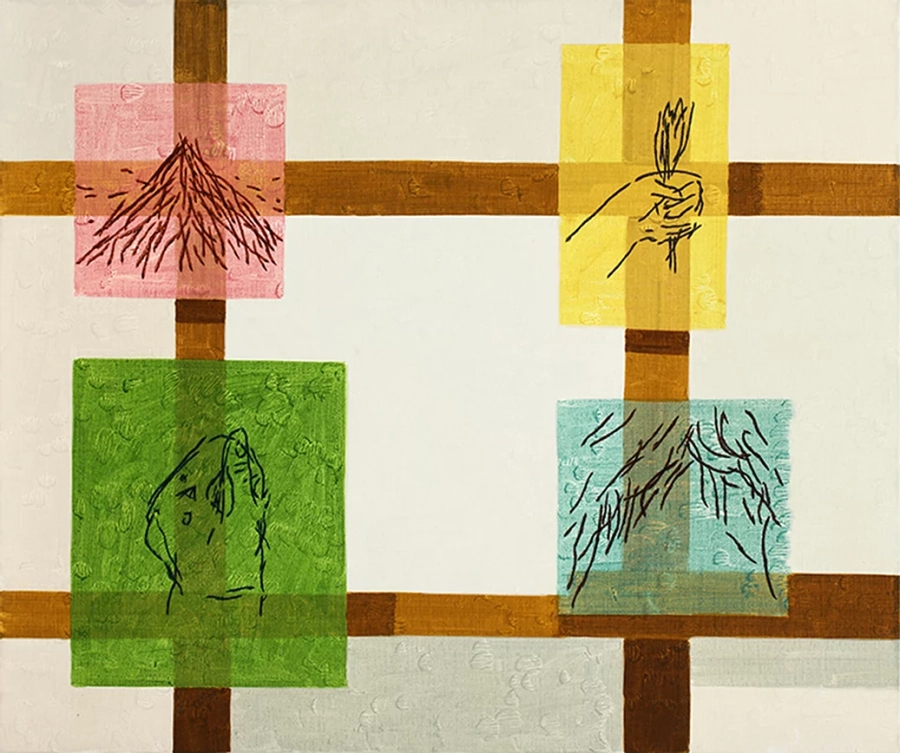 The vivacious painting in which all kinds of objects and figures flaunt their existence and enthusiastically interact with each other is in itself fascinating. When I saw Notes (2016), however, I was quite surprised and a bit puzzled. It stifled me in some ways, as the drawing nesting in the small square of the grid was broken and incomplete, rendering speech itself futile. Perhaps it was because the work didn’t evoke clear emotions like anticipation, fear, anxiety, and excitement but only those that are too trivial to define and occupy space. I had to dwell on the painting for a while to understand what it was.