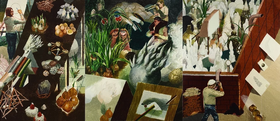 The gist of this experience is the repetition of power that both restrains my judgment and makes it endlessly lethargic and sparse. It is somewhat akin to the blinking of an eye. Sight and silence repeat themselves, and the world flickers and (re)appears at every cycle. The longer I close my eyes, the more new the world feels. The deeper the darkness gets, the closer we get to the rear end of an image and object. Following this wave, I am led to speculate that while this effect is triggered by the work itself, it also is a principle of life that the artist had to follow. I imagine myself in a seismic zone, in order to call all the visible forms into question and to pose the questions against the form. To the artist, the act of painting reveals the time spent in this seismic zone. The three protagonists in Curious Observers (2015) wear a cone, a white light beam, and glasses with two different colored lenses, and each does the looking while taking a rigid posture as if they can’t see anything. In front of them are onions or spheres on fire, but no one really recognizes them. The unrecognized objects remain unidentifiable. As in Curious Observer (2015), they merely relocate and (re)appear on the table, in the garden, inside a wall—and on the canvas. Scattered across time and space, objects are now removed from their contexts and reunited in one place. It is a process of repeatedly seeing, questioning, and finding where their forms belong. When the tides quiet, the flow finally reaches the painting. Perhaps drawing and painting managed to tame the turbulence with their forms and compositions. The painting of a curious observer approaches the world by embracing and introducing several parallax-like gaps.