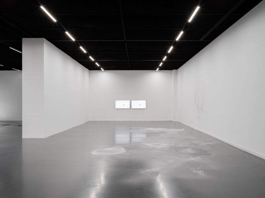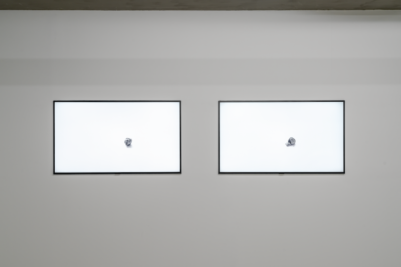반면 훼손되어도 무방하다는 것처럼 저지선 없이 가까이 다가가 볼 수 있게 한 말 그대로(2022)는 공중에 매달려 거의 존재감을 드러내지 않는 얇은 철망 구조물 평범한 날(2022)과 함께 놓여 있다. 이 영역은 마치 유령이 벗어놓은 껍데기들이 모인 양 허약하고 희미한 물질만 남아있다. 여기서 나는 보이고 만져지는 것이 이제 “매미의 허물”처럼 여겨진다며 오늘날을 숙고하던 작가의 말을 떠올렸다. 물질은 더 이상 당대를 증언하는 중요한 텍스트가 아니며, 당대에 위력을 발휘하는 힘을 추적하는 건 유령의 옷가지를 뒤적이는 일이 아니라 떠나간 유령의 행적을 조사함으로써 시작한다. 말 그대로와 평범한 날 옆에는 세계가 반복 상영 되고 있었다. 세계의 끊임없는 움직임이 호두를 둘러싼 그림자 속에 비친다.