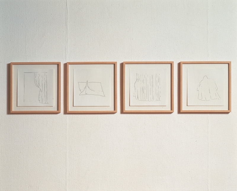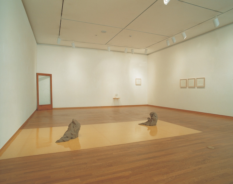 그런데 ‘조각가’로서 정서영이 수행해야만 하는 일은 사물이라는 움직임을 물질 속에서 다루어야 하는 비극적인 숙명 속에서 이루어진다. 이것을 비극이라 이를만한 건 움직임은 생성과 동시에 사라지는 것이고 물질은 사라지는 것에 대해 극히 무력하여 끝내 다다를 수도 정복할 수도 화해할 수도 없기 때문이다.5 이 비극이 가장 선명히 표현된 작업이 바로 유령, 파도, 불(1998)일 것이다. 불, 파도 모양의 유토와 유령 모양의 도자, 역시 유령처럼 보이는 모양이 에칭(etching)된 유리창과 먹지 드로잉 넉 점으로 구성된 이 작업에 대해 정서영은 “정해진 형태도 크기도 없으며 끊임없이 움직이는 것을 조각으로 만들고자 했던 것”6이라고 밝히는데, 김장언은 이와 같이 “고정된 형상이 없는 대상”, “비정형적인 에너지의 흐름”을 조각화 한 것을 통해 정서영의 조각에 대한 유령론(hauntology)을 전개하기도 했다.7 그러나 김장언이 유령, 파도, 불에서 환영으로서의 조각과 그 조각이 만들어 내는 거리(distance)를 중요하게 말했다면, 내가 이 작업에서 흥미롭다고 생각한 것은 “끊임없이 움직이는 것”이 형상화된 방식이다. 유령과 파도와 불은 유령, 파도, 불에서 각각의 방식으로 가장 전형적인 유령과 파도와 불의 모습을 하고 있다. 유령은 유령처럼 보이고 파도는 파도처럼, 불은 불처럼 보인다. 하필이면 지나칠 정도로 통속적인 이 모습은 내게 유령과 파도와 불을 가능한 한 충실히 재현한 결과가 아니라 오히려 반대로 유령과 파도와 불의 재현 불가능성을 끝내 선언하는 것처럼 보였다. 얼추 타협할 바에야 하지 않기를 택한다. 기만적으로 말할 바에야 말하지 않음을 통해서 말해지는 진실이 있다는 걸 보여준다. 여기서부터 조각은 조형과 조금씩 어긋나기 시작한다. 조각이 형태를 완성, 완결하는 것으로부터 멀어져 간다. 유령, 파도, 불의 먹지 드로잉 넉 점은 모두 ‘유령’이라고 이를 만한 어떤 것의 존재감이 천을 통해 매개돼 있다. 분명 무언가가 있는데, 커튼을 열어젖혀 보아도 그것은 도저히 인식할 수도 표현할 수도 없다. 하지만 거기에 아무것도 없는 것은 아니다. 다만 그것이 있음을 말하고 보여주는 것이 불가능할 뿐. 우리가 말하지 못하고 보지 못하더라도 거기에는 움직이는 무언가가 있다. 조각은 그 움직임의 시간에 육박한다.