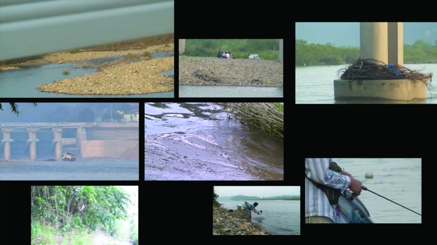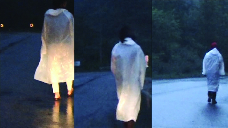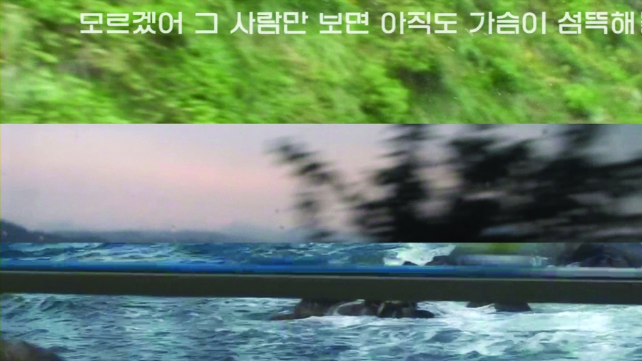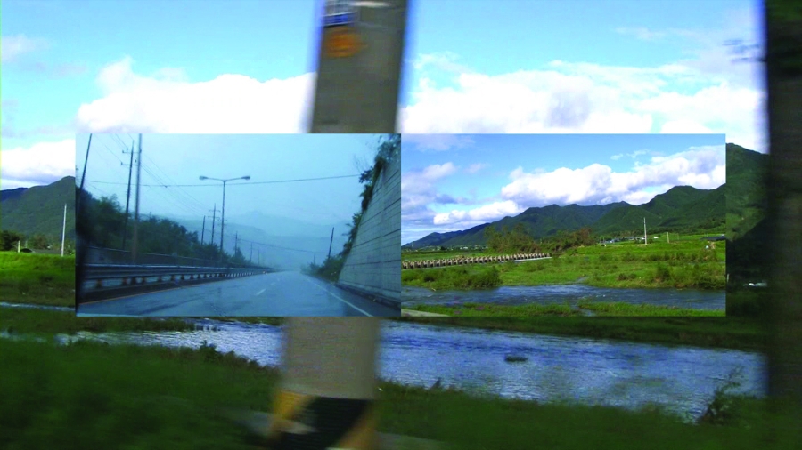 이듬해 파트타임스위트는 드롭 바이 덴이라는 이름으로 문산부터 강원도 간성까지 민간인 출입통제선 부근을 따라 이동하는 프로젝트를 진행했다. 서울이라는 도시의 구획을 벗어나 보다 더 넓은 공간에 대한 개입의 가능성을 탐구하고자 했던 10일간의 여행 동안 작가들의 손에는 카메라가 들려있었다. 드롭 바이 덴은 프로젝트의 결과물로 만들어진 영상 작업의 제목이기도 하다. 이 영상은 그물에 낚시용 부표를 붙여 강물에 띄우는 파로호에서의 퍼포먼스 기록을 보여주면서 시작한다. 이후 40여분 동안 단채널 화면에는 주로 차를 타고 이동하며 찍은 짧은 길이의 바깥 풍경 숏이 이어지는데, 이 장면들은 끊임없이 다양한 방식의 분할화면으로 변주되고 병치된다. 고속도로를 달리는 밤과 낮의 풍경이 같은 비율로 나란히 대비되기도 하고 서로 다른 크기의 작은 프레임 8개가 한 화면을 얼기설기 채우기도 한다. 심지어 이 프레임들 중 몇몇은 병치된 와중 다른 숏으로 바뀌면서 크기가 변한다. 수많은 짧은 숏은 세 멤버들 중 누가 촬영을 했는지 출처가 불분명한데, 화면에 기록된 (주로 풍경일 뿐인) 명시되지 않은 공간과 분열증적인 시간 감각으로 인해 그 익명성은 증폭된다. 인간의 신체가 마주할 수 있는 물리적인 시공간은 명백히 한정적이기에 영상이라는 기술적 지지체가 허구적 개입의 도구로 선택되었음을 이해하더라도, 이들이 파편적인 풍경을 끊임없이 변화하는 분할화면으로 재구성한다는 사실은 꽤나 의미심장하게 다가온다. 이 영상의 전체적인 서사는 분명 일종의 여행기이지만 분할화면 위로 짧게 나타났다가 사라지는 풍경의 이동, 그리고 그 분할의 형태조차 계속해서 변하는 화면은 서사를 뒷받침하기보다는 자꾸만 해체하려는 듯 보이기 때문이다. 아니, 그보다는 버석한 한줌의 모래처럼 쥐어질 수 없는 것으로 서사를 직조한다고 해야 하겠다.6