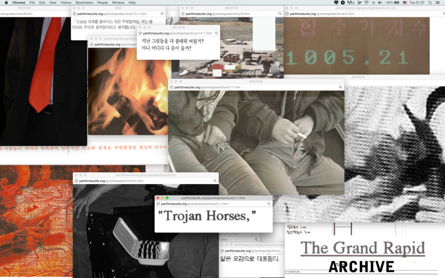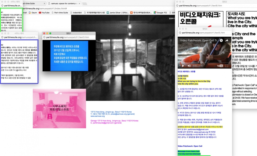 분할화면은 이후 파트타임스위트의 작업에서 중요한 형식적 기반이 된다. 2011년 아트선재센터의 City Within the City전에 참여했을 당시 사무소 공식 웹사이트(www.samuso.org)에 그들이 전시기간 동안 수행할 사무소 패치프로젝트에 관한 정보를 게시하여 그 공간을 점거하고(사무소 패치: 게시판), 창고 구석에 쌓여있던 케케묵은 미술 도록과 작가 포트폴리오와 같은 자료들을 잘라내어 스캔한 뒤 웹 공간에 재구성할 때에도(사무소 패치: 급속 아카이브) 분할화면의 변주는 적극적으로 사용되었다. 특히 2012년 1월 15일 자정부터 22일 자정까지 정확히 일주일동안만 볼 수 있었던 사무소 패치: 급속 아카이브에서 그동안 제대로 연구되거나 다루어지지 않은 작가들에 관한 텍스트와 이미지를 현재의 시점에서 선별하고 편집하여 76개의 팝업창으로 만들었을 때, 이는 명백히 주류 서사에서 제외된 주변적 역사, 당대의 미술계를 구조화하는 서사에 의해 망각된 역사를 재구성하고자 한 의지로 읽힌다. 그리고 그것이 지금 여기에서 다시 기능할 수 있는 방식을 상상한 것으로 보인다.7 그러나 그러한 비판적 입장보다 흥미로운 사실은 그들이 웹이라는 공간에 새로운 주소를 확보하여 페이지를 만든 것이 아니라 기존에 있던 사이트에 일시적으로 기생했다가 사라졌다는 점이다. 명시적인 무언가를 선언하지 않고 일시적으로 공간을 비틀어 본 후 흔적 없이 사라지는 이 방식은 앞서 실제 물리적 공간을 픽션적 상태로 만들었던 방식과 공명한다. 분할된 화면이 어떤 서사에 덧대어져 그 서사를 매 순간 갱신되는 자기-발생적인 것으로 바꾸어 놓을 때, 그것은 모종의 이상적 사회와 맞닿는 지점이 도저히 없어 보인다. 왜냐하면 자기-발생적인 서사는 무엇도 해결해줄 수 없으며 심지어 구체적인 어떤 것도 지시할 수 없기 때문이다. 현실정치의 기술과 사회과학 이론의 수사학이 대안을 요청하고 급진적 모델을 제안할 때(동시에 선택의 폭을 제한시키는 와중), 이와 같은 자기-발생적 모델은 헛되어 보일 뿐이다. 이들의 작업은 왜 흩어짐을 자처하는가? 혹은 왜 필연적으로 사라질 수밖에 없는 조건에 이끌리는가? 왜 픽션의 완성이 아닌 픽션의 ‘실패’로 뒷걸음질 치는가?
