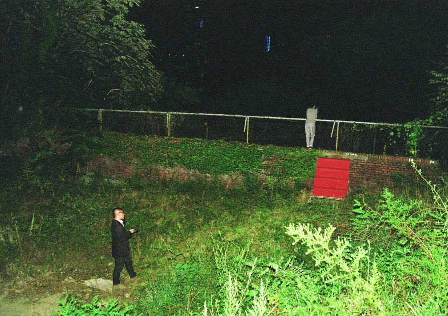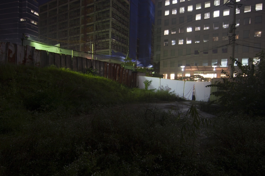 몇 달 후 연이어진 오프-오프-스테이지는 종로구 신문로 160-1번지, 즉 광화문역 바로 앞 빌딩 숲 사이의 공터에서 이루어졌다. 서울에서 땅값이 가장 비싼 지역 중 하나인 휘황한 도심 한복판에 어색하게 자리 잡은 이 무용한 장소는 파트타임스위트에 의해 일종의 무대가 되었다. 하지만 그들은 특별히 무언가로 그곳을 꾸미지 않았다. 다만 공터에 들어서는 입구에 각목으로 어설픈 구조물을 만들어 놓았는데, 낮에는 앙상한 골조만을 그대로 드러내놓고 있었지만 해가 지고 나면 흰색 천이 덧씌워져 일종의 장막 역할을 했다. 공터를 찾은 관객은 귀마개와 손전등을 제공받았고 녹슨 컨테이너와 우거진 수풀이 자리한 공간을 이리저리 배회했다. 그리 크지 않은 부지임에도 이 땅은 종로구청과 같은 관공서, 공사 도중 부도가 난 고급 오피스텔 등 서로 다른 주체가 소유주로 혼재해 있었고,4 공터를 가로질러 허공에 매어진 방울달린 고무줄은 바로 그러한 기이하고 추상적인 도시 공간의 소유권을 가시화시킨 설치물이었다. 이러한 설치물이 특정한 사회적 질서를 은유한다고도 볼 수 있지만, 보다 더 중요한 것은 이곳을 어떻게 임시적인 경계로 구획하는지, 즉 공간 자체를 재형성하기 위한 상상의 방식이었다. 파트타임스위트는 연극의 몇몇 요소를 차용해 공터를 일시적인 공간으로 작동하도록 만든다. 작가는 이 작업에 연동되는 짧은 희곡을 썼고 이를 통해서 도시 전체를 일종의 연극 무대로 삼았음을 드러낸다. 이야기에는 총 세 개의 세트가 있으며5 주인공 A와 B가 등장하지만 이들은 특정한 캐릭터라기보다는 불특정 다수의 관람객임을 알 수 있다. 관람객들은 임의적으로 A 또는 B가 될 수 있는 것이다. 여기서 파트타임스위트가 무대화한 공간은 매우 임의적인 움직임이 생성되는 곳으로 변모한다. 빛으로 가득 찬 메트로폴리스 세트1과 다다를 수 없는 완전한 어둠의 세트3 사이에 낀 세트2는 정의내리기 힘든 회색지대다. 이곳은 관객에게 어떠한 정체성이나 움직임의 방식도 부여하지 않기에 완전히 자기발생적인 행위들로 점철될 뿐이다. 희곡은 다음과 같이 시작한다.