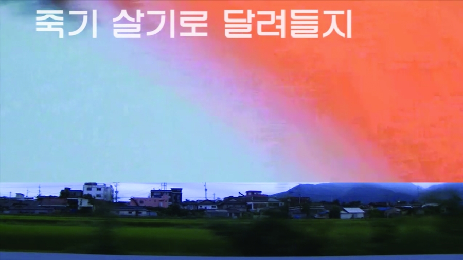 이들이 영상에 텍스트를 사용하는 방식은 이처럼 결속되지 못하는 서사의 상태를 강화한다. 세 줄로 분할되어 빠르게 흘러가는 서로 다른 풍경을 병치시킨 부분에서 각 화면 위로는 텍스트 또한 흘러 지나간다. 그 내용은 북한과 인접한 전방 지역의 역사적 기억을 상기시키며 강한 정치적 논점을 호출하지만, 왼쪽에서 나와 오른쪽으로 사라지는 텍스트의 움직임은 문장을 문법적으로 독해하는 것을 방해한다. 언어의 선형적 인식이 중단되면서 텍스트는 내러티브를 전달하지만 동시에 내러티브를 다른 감각으로 분산시킨다. 파트타임스위트는 드롭 바이 덴 프로젝트를 진행하면서 해당 지역 사람들의 말을 녹취하거나 작가의 기억에 의존해 다시 서술한 텍스트로 러캐스트라는 제목의 낭송 퍼포먼스를 하기도 했다. ↩