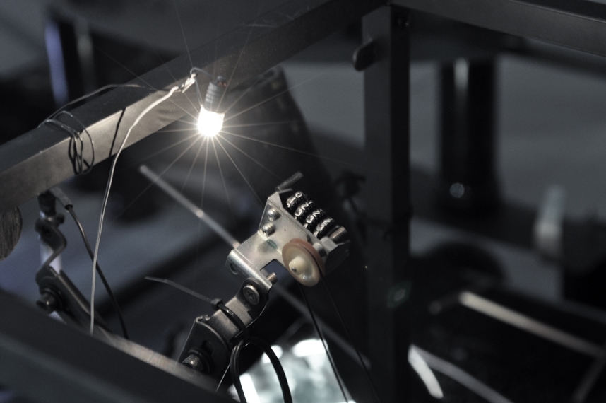 Gomyomsom creates different types of temporality through the repetitive sounds and movements of the devices. However, the important point lies not in the fact that many arbitrary units of time exist but the very way in which such arbitrary temporality operates in the exhibition. I visited the exhibition 8 times, and from the third visit I started to become interested in the sense of time created by several mechanisms. I also measured time through various ways: one day using a watch with a second hand, another day with a stopwatch in digital clock, and in many times, I tried to read the interval of time through my instincts, using my physical body such as my footsteps. And my final conclusion was that the time in this space ‘can never be gauged’. The reason I had to come to the exhibition so many times was not because I wanted to transform every experience into information and arrive at a more complete conclusion as if to put pieces of a puzzle together; it was because the show was clearly ‘different’ every single time. This doesn’t signify the irreversibility of linear time, nor does it conclude to mean that it is a performative work which is differently perceived through the ‘present’ perception of the audience. Gomyomsom deals with a very delicate thickness of time which is very difficult to perceive; therefore, a fictional world that’s always renewed is conditioned in the exhibition.