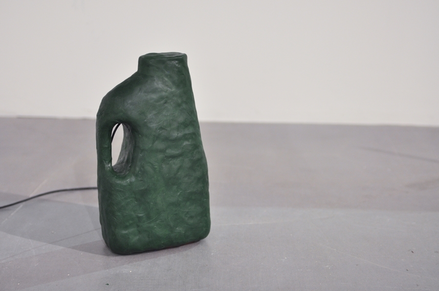 While the mechanisms mentioned above operated in such a subtle way that they were almost unrecognizable without paying a close attention, there were also loud and clear sounds in the exhibition which dominated the entire space of the gallery. Green Horn is a common bulk-sized detergent bottle coated with a thick layer of green urethane. At a glance, it seems to stand in space without any meaning, but it sounds a foghorn throughout the gallery roughly about every 20 minutes. In one corner of the gallery is Paper Drop Apparatus which creates the most spectacular scene in the exhibition. Each of the 12 paper dispersing devices drop sheets of white paper with the text “Let’s not forget the contract between light and gravity / _year_month_date_time” pressed into the paper, in an interval of time set to the sound of the melodeon installed underneath it. The mechanical device connected to the bulk compressor inserts air into the melodeon and presses its keys at a fixed interval of time, and the combination of the 9 pressers changes each time. It’s recorded that the interval of time in the sounding of this device was 8 minutes when the work was shown in PLATEAU, Samsung Museum of Art in 2014, but it increased to 13 minutes in Gomyomsom in Doosan Gallery. Together with Green Horn, the sound of the melodeon, activated with Paper Machine, clearly creates a new sense of time.