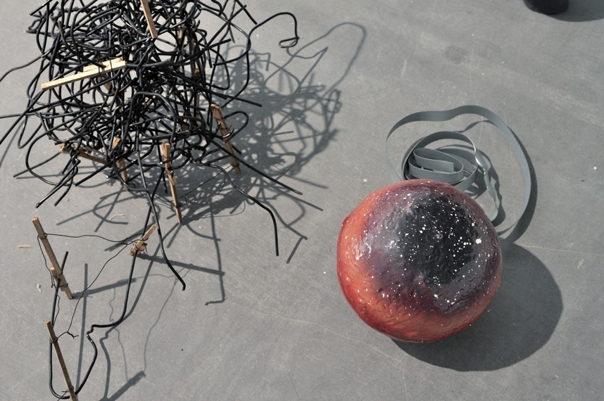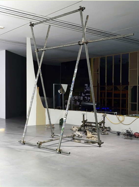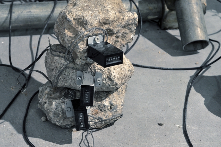 There’s a strange sense of time in the gallery. (Several) strange indescribable sounds can be heard in (a few) indefinite places that are difficult to locate. These sounds are created by mechanism-objects located throughout the exhibition space. The hand-sized device on Display has thin copper wires drooped down like the legs of a grasshopper, and these legs rise up in a fixed interval of time, then drop down. The vibration of a small motor the size of a finger which seems to have come out of a children’s toy, and the friction sound of metal are heard also on a fixed interval. In Where Concrete Stones Count, metal scaffold is cut into shorter pieces and tangled up, and concrete lumps slightly larger than fist are randomly scattered around it. A plastic scale capable of counting up to 6 digit numbers on their own is embedded into each of the concrete lumps like rock barnacles, all connected with electric wires. The scales, over ten in quantity, are all gathered in one place and produce the same sound, but each scale produces in its own rhythm and duration. Observing all the numbers expressed in 6 digits and discovering the common law of the numbers in a group is almost a humanly impossible task. Observing all the scales count up to all six digits would take 278 hours, given that the observer counts one number per second. But even then, the actual number counts slower than in seconds. The audience can only experience the time segmented by the scales and the overlapping of such segments of time.