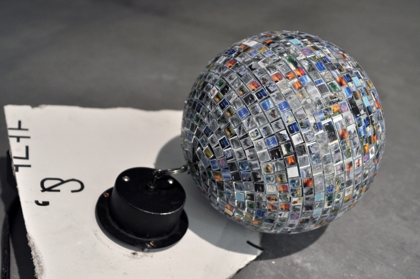 Such errors were possible in Zorn’s Lemma because the film, consisting of a series of frames, was used as the basic elements of the work. In the same way, such errors are possible in Gomyomsom because all moving mechanisms were made unstable, directly through the ‘hands’. If the imprecise boundary is a type of error, it in turn demonstrates the scope of firm and stable system. In this perspective, it’s evident that Gomyomsom is not only just about filling the space where narrative has been removed with operations of devices that continue malfunctions. There are a few elements that remain as questions, and one of them would be that images with almost no information are put into the exhibition space. Upon closer inspection of The Big, in which two long scaffolds are connected like a stand with its legs open, it’s covered with kitschy stickers of cliché illustrations of sunset ocean views and 3D modeling of automobiles. This is a part of the image in the work Quarrel, in which small rectangular mirrors, imprecisely cut by hand, are plastered (with irregular gaps) onto the mirror ball. On the rectangular mirrors in Quarrel, countless images are cut accordingly in size and meticulously glued to each mirror. Other than the kitschy images mentioned above, there are also unidentifiable images captured by surveillance cameras and images of emoticons (made by the artist himself) used in smartphone messages. Although the same types were used many times, it’s difficult to tell what rules they follow, and they hover in their own directions without any standards. There is a loop on one vertex of the mirror ball, and it’s connected to a small motor which makes it move periodically. While it’s supposed to move in a circle, the plank on which the motor is affixed disturbs this movement and makes it move slightly to left and right. The indistinctive images with unknown sources move here and there (literally) on top of the mirror ball in a very microscopic dimension.
