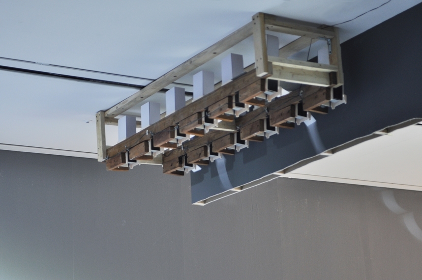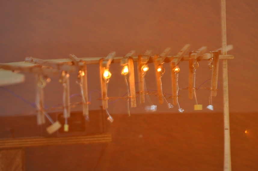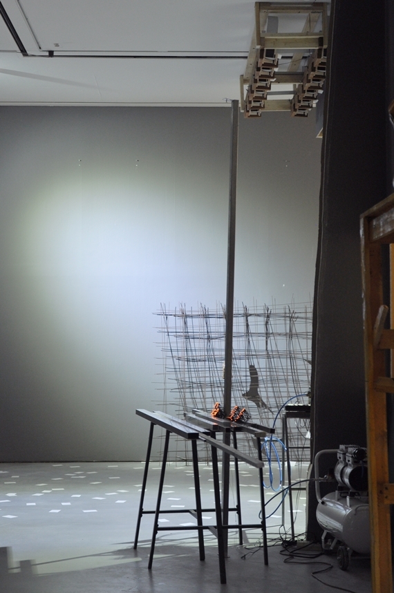 Contrary to its title, the wind actually does blow in the work If Wind Doesn’t Blow. This wind isn’t constantly generated but, like other mechanism-objects, intermittently produces wind in set intervals. A dozen or so wires hang over the object and the silver sticker at the tip of the wires quiver with the wind. The shaky wires make contact with the copper rings that surround them, and whenever the contact is made, electricity is passed and the lightbulb on the wooden stick comes on. The interval of the wind blowing is regulated but the time the light remains on is very arbitrary. OOsun, a huge steel structure filled with completely useless material in terms of function, produces a few sounds on regular set of time. Short strange metallic sounds are generated every time a long piece of wire drawing circles makes a contact with the rolled-up steel plate on top of the structure right next to the wire. While this sound audibly seems regular, a very subtle and persistent difference is sensed in the cycle of the sound due to unknown external conditions. There is a small monitor affixed at the bottom of the structure, and in front of it is a mechanism which makes sounds on a fixed interval of time. This mechanism consists of a hydraulic motor and wood which makes a loud striking noise every 30 seconds. This interval, however, is also arbitrary: sometimes it takes 31 seconds, and sometimes it takes 28 seconds.