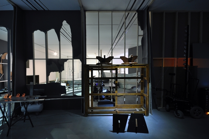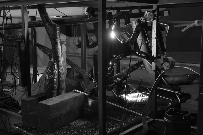 In the vacuum-like state without a single narrative, the artist-made mechanisms and completely ambiguous objects (and images) stir up a feeling of unrest in the viewer, which isn’t like a psychological anxiety nor unstable physical sensation of riding an amusement park ride. Then what is this feeling of unrest or uncanniness? There is too much information in the exhibition to be singularly perceived or described. Besides the elements mentioned above, it’s difficult to describe the sense of beauty in the woodcut up in all directions, steel structures that are complexly grafted together, and the piles of electric lines that are tangled up for no apparent reason. To apprehend everything in the exhibition, this place would demand an almost infinite amount of time. Therefore, the proper name ‘Gomyomsom’ can only be arbitrarily fixed as ‘this and that’. However, what characterizes Gomyomsom is that the unselected is not removed and remains undoubtedly as ‘something there’. Something which undoubtedly exists can remain and be recognized as a possible world, probably because the simple, plain and sealed virtual world, which the narrative introduces, has been broken down. In other words, all sorts of things without hierarchy fill Gomyomsom, and if there were to be a hierarchy, it would only be imposed upon by the viewer. Ultimately, anxiety might be another term for the pressure to make completely independent decisions in a place where all possibilities are conditioned to be displayed in full at once. More precisely, however, the uncanniness is a result of the incarnation of things that still remain visible (without disappearing) even after the decision. The sensation of the sound and movement being repetitive — which are actually reverberating unstably in very subtle dimension and thus include countless perpetuation — is related to this feelings of unrest in the sense that they are never converged into one system. Because the pressure for decision given to the audience is quite strong in Gomyomsom (the audience also has the right to not decide on anything in the exhibition), it does not impose one singular reflection upon the audience. I think that all processes themselves in Gomyomsom are one metaphor, and what it alludes to is not fiction but the very way in which such fiction is created.