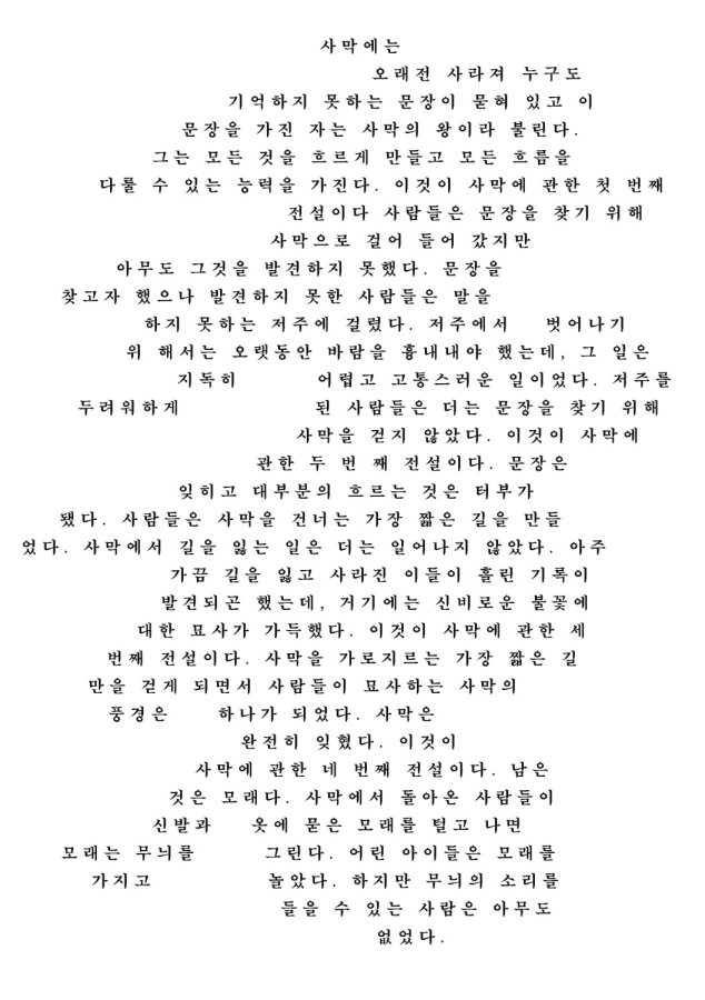 문장은 잊히고 대부분의 흐르는 것은 터부가 됐다. 사람들은 사막을 건너는 가장 짧은 길을 만들었다. 사막에서 길을 잃는 일은 더는 일어나지 않았다. 아주 가끔 길을 잃고 사라진 이들이 흘린 기록이 발견되곤 했는데, 거기에는 신비로운 불꽃에 대한 묘사가 가득했다. 이것이 사막에 관한 세 번째 전설이다.