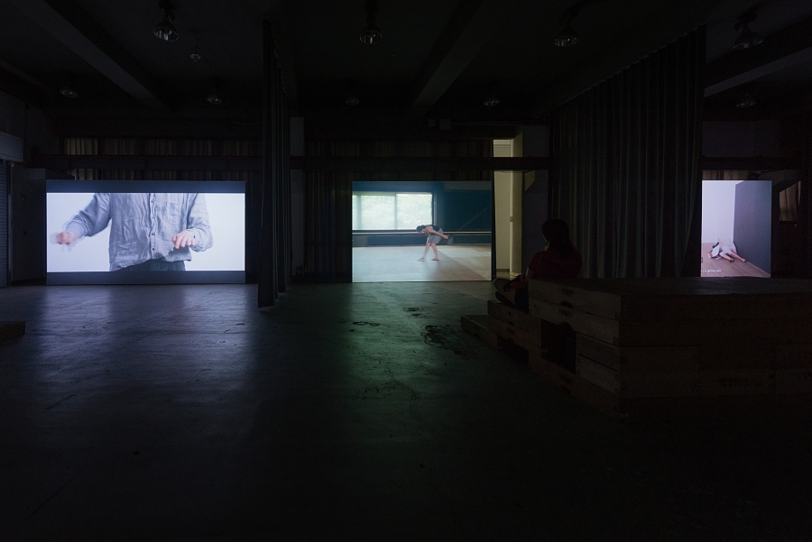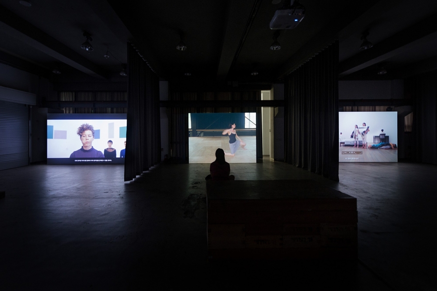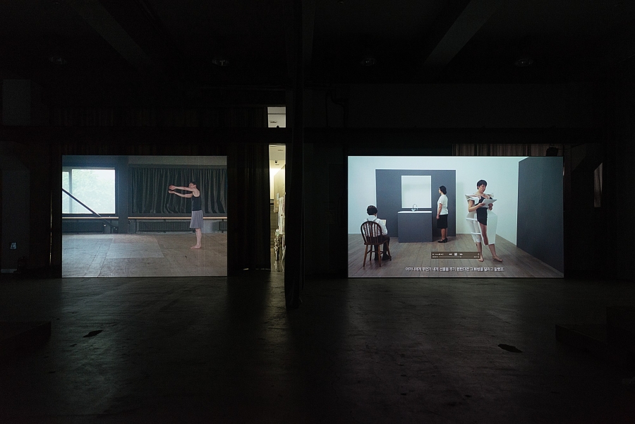 For Moving/Image, videos related to performances by Manon de Boer, Marie Cool & Fabio Balducci, Julien Prévieux, and Grace Schwindt were shown repeatedly in the gallery, while actual performances by Park Minhee, Parc Rahm, and Oh Min were staged over the exhibition period. Viewed purely in terms of its external aspects — performance and video — it called to mind memories of Performing Film, an exhibition held at the Coreana Museum in 2013. The Coreana Museum had worked steadily to plan an exhibition focused on the keywords of “performance” and “video,” and the Performing Film exhibition was an attempt to truly explore the relationship between them from a medium standpoint. Yet it only emphasized the relationship in terms of bodies being converted to video form, without any trenchant points to be found. Starting from a modernistic standpoint that saw body and screen as individual hypokeimena for forms of artistic expression, it seemed to do no more than reveal combinations and differences between media, with no apparent interest in why those combinations or differences were important. Whereas Performing Film foundered somewhere between medium-specific and inter-media — lumping all of its individual pieces into a single category — Moving/Image has the same external combination of performance and video, yet summons an entirely different debate. What the exhibition seeks to visualize through its carefully selected pieces are movement of the bodies and the images that may arise during performance. In looking at the standing these images occupy and the functions they elicit, it demands a new way of understanding the relationship between image and performance.