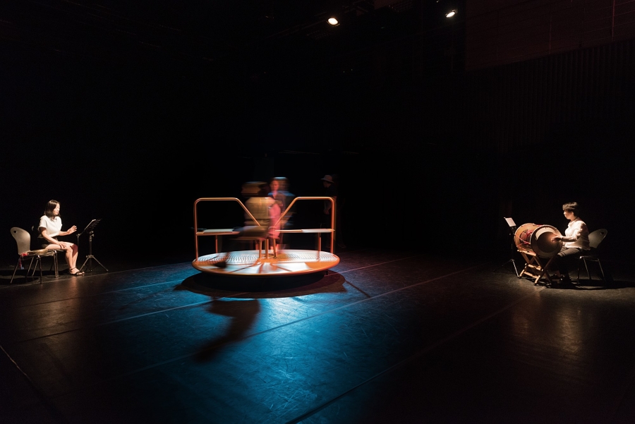 The attempt to actively impinge on the viewer’s manner of perception and produce a new kind of visuality is even clearer in Park Min-hee’s Gilgunak. The name gilgunak refers to a song in the gasa style, which tends to be included together with sijo in the genre known as jeongga. With the exhibition, the artist is reconstructing less the song itself than the song’s location. Just four people at a time are admitted to the short performance, which lasts just over 20 minutes. Visitors sit a circular structure at the center of a stage that is designed to rotate, allowing them to see out in all directions. As the viewers are flanked by Park singing the gilgunak and a janggu ( a kind of drum) for accompaniment, other staff rotate the circular structure where the viewers sit throughout the performance. Spinning around in a circle, the viewers are prevented from focusing visually on the person singing, so that the performers, exposed to powerful pin lighting, seem to flicker amid blackened, empty spaces. By imposing harsh physical constraints on the viewing conditions, the piece offers a new context for appreciating the music. Park Aram also makes proactive demands on audience action, yet the place where she creates images is, uniquely enough, in the viewer’s imagination. Second Figure Drawing Practice begins with an announcement: “This has been organized to explore visual forms that cannot be seen, that cannot be touched, yet are possible.” Viewers of the figure drawing performance have a large grid on the stage that they can use as a layer; as they listen to orders, they have to draw and transform lines in their head, imagining virtual geometric shapes. The figure drawing takes the form of five different methods, where the images drawn in the imagination linger as something completely random, something that cannot be confirmed or compared with what others create. The strict rules and procedures conveyed through speech are reduced to highly individual images within the space in which the viewer participates.