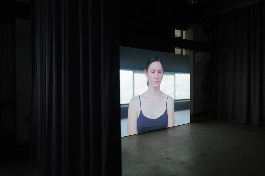 결국 다시, 움직임의 이미지는 프레임의 밖을 상상하고 시간을 부여받기를 요청한다. 슈빈트는 한 인터뷰에서 자신의 영상작업을 퍼포먼스의 기록으로 생각하지도 않으며, 그렇다고 영상작업이라고 생각하지도 않는다고 말한다.2 그렇다면 과연 무엇일까? 이번 전시에서 가장 인상적이었던 부분 중 하나는 영상작업을 프로젝션하기 위한 설치 방식이다. 일반적으로 영상이 전시장 안에서 상영될 때에는 벽 혹은 벽 위의 스크린에 그대로 투사되어 매우 평면적인 것으로 취급된다. 그러나 무빙/이미지에서는 마리 쿨 & 파비오 발두치의 작업을 제외한다면 모두 삼차원 공간 위에 세워진 가벽에 투사되었는데, 이 가벽의 표면은 질감을 지닌 직물이 덮고 있다. 그리하여 영상은 일종의 사물이기도 하면서 주변 환경과의 관계에서 오묘한 입체감을 지니게된다. 이것은 앞서 언급한 행위 이미지들의 특질을 관객이 좀 더 정확하게 마주하게끔 하는 섬세한 장치로 보였는데, 왜냐하면 바로 이러한 방식으로 인해서, 투사되는 이미지는 미니멀리즘이 요구하는 것과 같은 맥락의 시간과 장소를 끌어오기 때문이다. 바꾸어 말하면, 신체의 이미지가 요구하는 바는 전시장의 조형 자체에서도 암시되는 것이다.