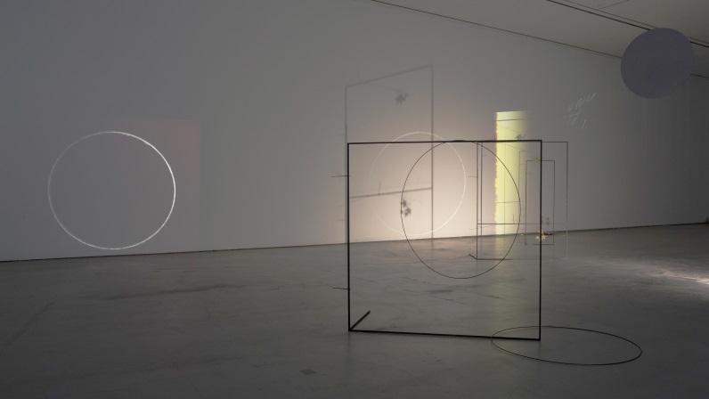 박주연의 접미사, 접다(2017)는 전시장 대부분의 부피를 차지한다. 35mm 슬라이드 프로젝터에서 나오는 빛은 그 앞에 놓여 제자리에서 돌아가는 거울 통해 전시장 전체를 훑는다. 빛 속에는 둥근 원의 윤곽이 어렴풋하고, 이는 철사로 만들어져 곳곳에 설치된 구조물과 겹쳐졌다가 분리되고 가까워졌다가 멀어지기를 반복한다. 여기서 언어의 문법적 요소 중 ‘접미사’에 작가가 집중했다는 사실은 흥미롭다. 언어가 세계를 재현하고 전달하는 가장 보편적인 수단 중 하나라면, 이 언어를 구성하는 구체적인 요소들의 역할은 서로 다르다. 명사와 동사가 의미와 형상을 지시하거나 설명하는 데 핵심적인 기능을 담당한다면, 접사는 그 의미를 변형시키고 맥락을 옮겨놓거나 혹은 무너뜨린다. 그 자체로는 어떠한 기능도 없기에 단독으로는 언어적인 기능을 할 수 없다. 바로 그러한 언어적 요소가 전시장에서 시각적 대상이 되었을 때, 그것이 구조화하는 경험 또한 무언가를 지시하지 못하고 불명료하게 된다. 단지 관객의 시간에 달라붙어 그 자신의 기능을 제안할 뿐이다.