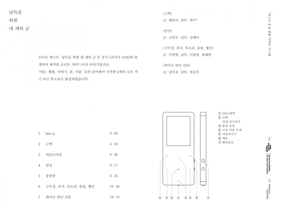 우리는 일군의 예술 담론이 전시장이라는 공간을 이와 같은 분산적 지각이 가능한 해방적 공간으로 열렬히 홍보해 온 것을 잘 알고 있지만, 실제로 그것이 성공적일 만큼 정치적이었는지는 의문이다. 고개를 이리 저리 돌리고 몸을 여기저기로 이동시키며 분산적 지각의 기억을 구축하는 것만으로는 문제가 그렇게 간단히 해결될 것 같지는 않다. 무언가가 더 필요해 보인다. 가시적인 것들의 몽타주를 초과하는 무언가가 말이다. 여기에는 일종의 방법의 전환이 필요해 보인다. 그리고 그 방법을 하나의 집합으로 생각했을 때, 그 집합 안에 포함될 끝없는 계열체의 목록을 만들어야 한다. 이 집합은 아마도, 전통적인 서구 형이상학의 체계에서는 비실재하는 것이거나 열등한 것이거나 정의 불가능한 것들, 자본주의 하에서는 무용하고 가치없고 감각되지 않는, 그러나 바로 그 시스템에 혼란을 초래할 것들의 목록일 것이다. 이 목록은 이분법에 기반한 사고방식을 해체하기 위해 진력하고, 일련의 대립을 유용하지 않은 것으로 만든다. 소리와 목소리는 그리하여 데리다에게 존재와 의미를 규정하는 기호 체계를 근본적으로 다시 사유하는 방법이다.