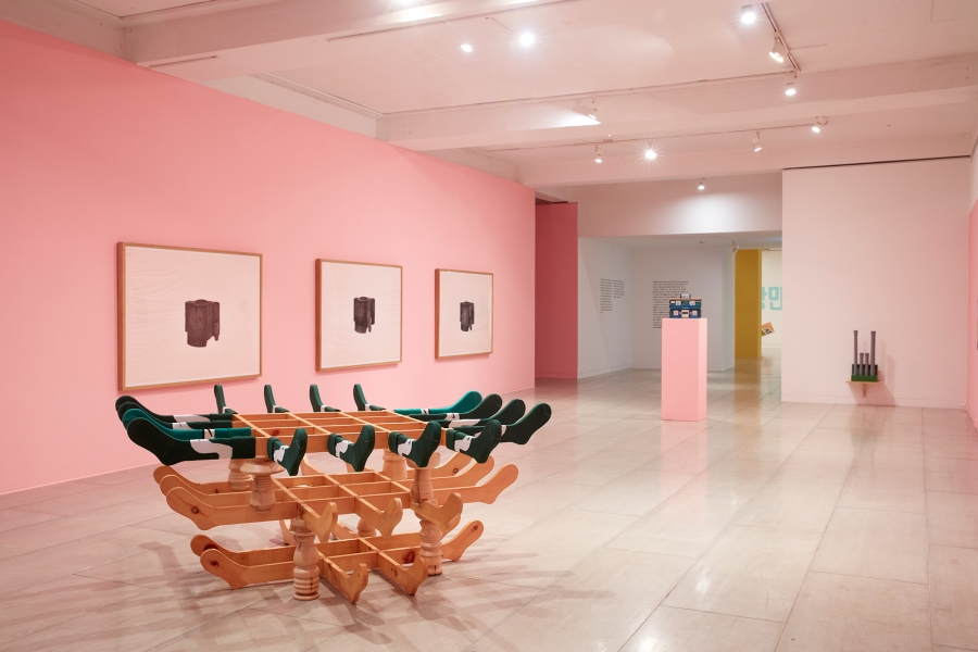성곡미술관에서 진행되고 있는 김나영과 그레고리 마스의 유사-회고전 리프로스펙티브는 지난 2004년 결성 이후 제작한 수많은 작품들 중 몇몇을 선별해, 마찬가지로 그들의 지난 전시 제목을 그대로 가져 온 네 전시장(‘무아 자기도취’, ‘낭만 결핍증’, ‘시스템의 목적은 그 시스템이 하는 일’, ‘무감각의 미’)에 나누어 놓은 작업이다. 집의 미니어처와 분자 구조 모형이 나란히 놓인 부동산(2012-2019)이나, 도라에몽과 친구들 인형, 신라 시대 토기 복제본 등의 모형이 기울어진 좌대 위에서 다시 수평을 맞춰 서 있는 네가 알아내라같은 경우 작업을 구성했던 요소가 바뀌며 새로이 갱신되었다. 각각의 전시장은 양가적인 상태의 중첩과 충돌, 하위문화 양식의 변용, 체계에 대한 관심과 그에 대한 사적인 수행, 미술의 역사에 대한 당대적 코멘트 등의 주제를 가늠해볼 수 있는 작업들로 직조되어 미술이라는 것의 근본적인 기능을 강조한다. 이것은 미술제도2로부터 주변적인 사물과 언어, 문화의 요소를 재배치함으로써 사물의 다른 역학을 위한 장(場)을 구성하고 세계에 대한 개념과 인식, 행동의 방식을 조정하려는 작가의 방법론이 자기 자신의 역사를 대상으로 삼은 위트이자 자기 자신의 픽션 만들기 라고 할 수 있을 것이다. 리프로스펙티브를 유사-회고전이라고 한 것에는, 작가의 작업 방법론에 비추어 봤을 때 지난 작업을 재사용하는 것이 회고적인 의미를 가진다기보다는 새로운 서사를 구성하는 행위로 보는 것이 타당하기 때문이다.3 작가는 한 인터뷰에서 이전 작업들을 다시 전시 공간으로 불러들여 재배치하는 것의 의도에 대해 질문 받았을 때, 만화 작가 오사무 테츠카의 방대한 작품 세계에서 개별 작품을 널뛰며 반복적으로 등장하는 인물들을 예로 들며 “그 인물들은 작가와 작품 전체와 동고동락하며 관객과의 유대를 만드는 독특한 역할을 한다”고 설명한다. 이런 측면에서 보자면 김나영과 그레고리 마스의 작업 전체는 작품 단위의 사건을 가로지르는 일종의 영화적 공간에 가까우며 매 번의 편집과 연출을 통해 새로운 서사를 구성한다. 끊임없이 빠른 속도로 많은 작품을 생산하는 그들의 작업 방식은 전 세계의 수많은 도시를 노마드처럼 이동하며 작업하는 삶의 양태 속에서 그때그때의 상황에 대한 즉각적인 대응이기도 하지만, 서사의 재생산을 위한 요소들의 저장소 구축에 있어서 필연적인 충동이기도 할 것이다.