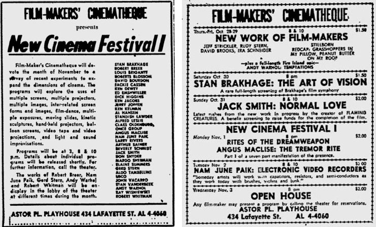 1964년 뉴욕으로 이주할 당시 백남준의 여행용 비자를 위한 스폰서가 바로 메카스였다. 메카스는 플럭서스의 핵심 인물이었던 마키우나스와 잘 알고 지냈다. 백남준이 뉴욕에서 처음으로 영화를 위한 선을 선보였던 것은 1964년 마키우나스가 초대해서 참여하게 된 플럭스홀(Fluxhall)에서의 6주간의 플럭서스 페스티벌(Fully Guaranteed 12 Fluxus Concerts)이었다. 백남준은 4월 25일 다섯 번째 콘서트(Concert No. 5)에서 피아노를 위한 플럭서스 콘서트(Fluxus Concert for Piano)라는 제목의 작업과 함께 영화를 위한 선을 선보였고, 5월 8일 여덟 번째 콘서트(Concert No. 8)에서는 영화를 위한 선을 단독으로 상영했다. 브루스 젠킨슨에 따르면, 이 행사에서 영화를 위한 선은 “업라이트 피아노와 더블베이스가 놓인 다락 공간의 전면에 위치한 가정용 영화 스크린의 절반도 채우지 못한” 크기로 상영되었다. 1965년 11월 2일에는 조나스 메카스가 필름메이커스 시네마테크에서 만든 행사 ‘뉴 시네마 페스티벌Ⅰ’에서 영화를 위한 선을 선보였다. 다케히사 고수기는 이 행사에서 백남준이 노출된 빈 필름과 노출되지 않은 빈 필름 두 가지 버전으로 스크리닝했을 뿐만 아니라 여기에 라이브 퍼포먼스를 결합시켰다고 회고한다. 피터 무어가 촬영한 영화를 위한 선과 관련된 가장 유명한 사진이 바로 이 행사에서의 기록이다. 이 사진을 보면 백남준은 영화를 위한 선이 상영되는 스크린을 마주하고 서 있다. 한 해 전의 상영과는 달리 스크린의 크기가 훌쩍 커졌다. 그는 영사기와 스크린 사이에서 이리저리 움직이며 화면을 드나드는 간단한 행위를 수행했는데, 이는 퍼포먼스라기보다는 영화를 위한 선에 대한 백남준 자기 자신의 관람 행위처럼 보이기도 한다. 즉 영화의 미니멀리즘적 경험인 것이다. 메카스는 「빌리지 보이스」에 다음과 같이 썼다. “백남준의 (시네마테크에서의) 저녁을 보았을 때, 나는 깨달았다. 라 몬테 영, 스탠 브래키지, 그리고리 마르코폴로스, 잭 스미스, 혹은 (의심의 여지 없이) 앤디 워홀의 예술처럼, 그의 예술은 천 년 동안 이어진 미학적 법칙에 의해 지배되고, 다른 고전적인 예술의 작품들과 마찬가지로 분석되고 경험된다. (…) 빛이 이미지가 된 자리에 이미지 자체를 없애버렸다.”
