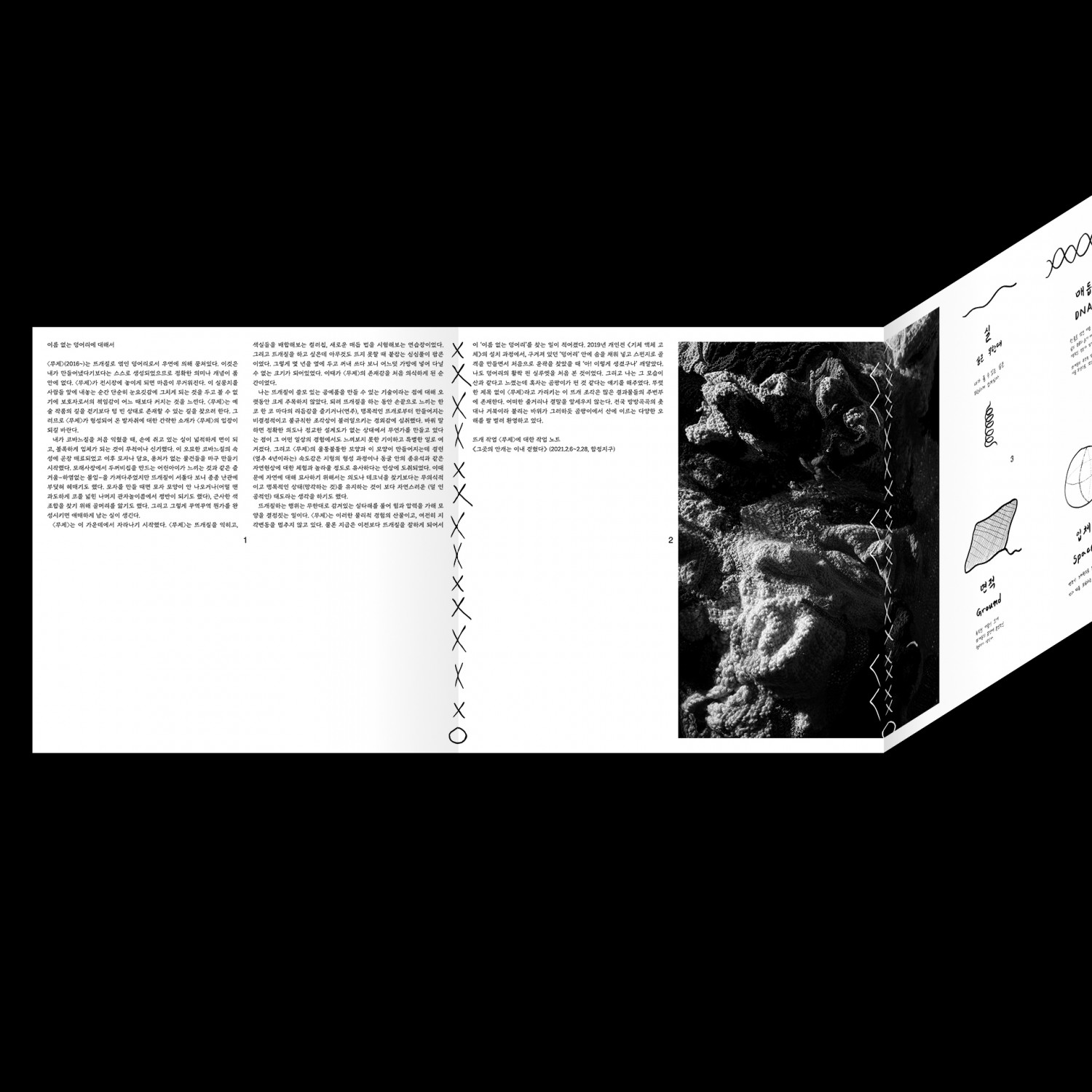 한 코 한 걸음은 작가 여다함이 뜨개 낙서에서 시작된 움직임을 통해, 스스로의 보폭과 속도를 가늠해보고자 하는 시도를 하나의 타래로 묶어낸 책이다. 여다함은 양 손에 코바늘과 실을 쥐고 한 코 한 코, 느린 걸음으로 감각의 덩어리를 짓는다. 그는 뜨개질을 단순한 공작 활동이 아닌 온 세상의 리듬에 주의를 기울이는 일로 여기며, 이 오목하고 볼록한 덩어리가 다시 몸짓과 말짓으로 옮겨질 수 있을지 자문한다. 그는 이러한 고민을 다섯 명의 동료들과 나누고, 이내 흩어지는 이야기 속에 내재된 리듬을 가만히 건져넨다. 그간의 대화와 골몰한 시간들로 풀어낸 글과 그림은 지면 위의 길과 모퉁이를 따라 흐르며, 감각의 조각보를 그려낸다. 정방형의 실을 감았다 펼쳐내며, 각자의 걸음으로 그의 여정에 함께 하기를 바란다.