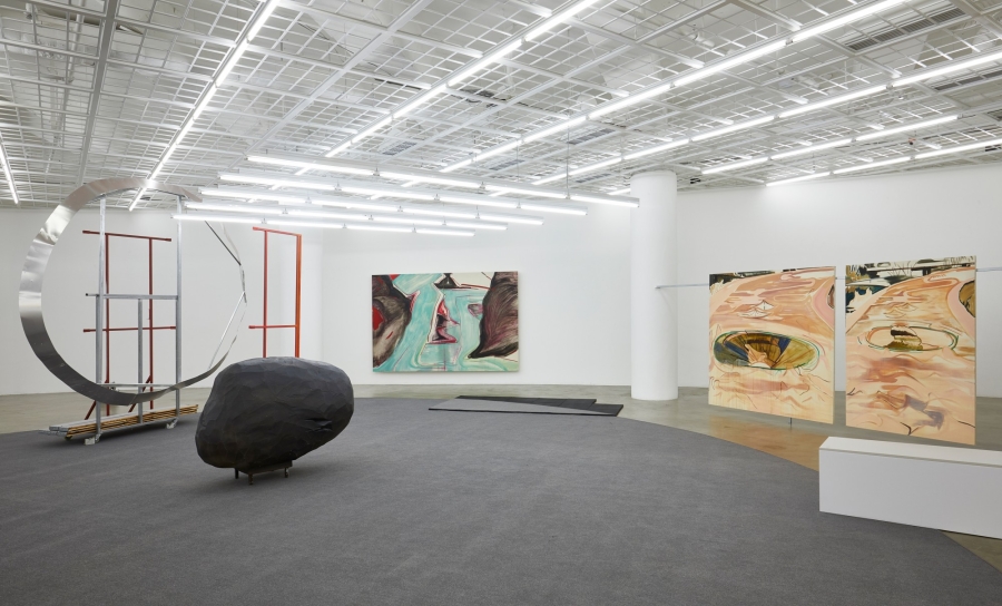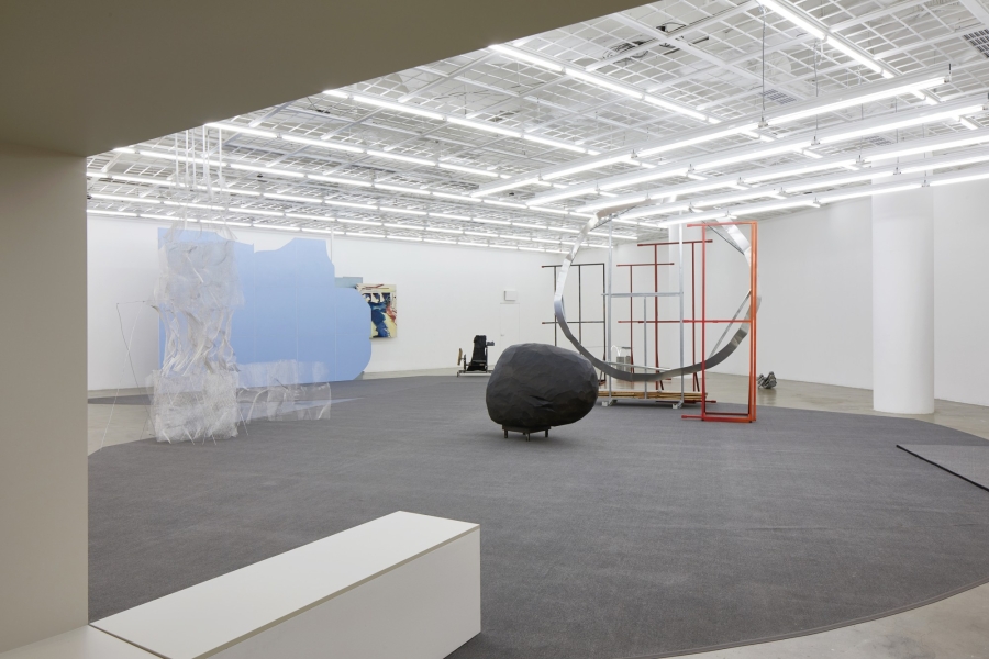 김세은의 회화와 정지현의 조각에서 전개되는 조형은 형식적으로 유사하다. 우리는 그것을 선과 면, 두께와 틈의 측면에서 접근해볼 수 있다. 김세은의 작품에서 선은 판단의 수행처럼 보이는데, 즉 방향과 속도, 길이에 대한 단호한 결정을 화면에 축적하는 것이다. 때문에 독립적인 개체라는 인상이 강하며, 따라서 언뜻 특정한 풍경과 그 안의 대상을 재현하기 위한 윤곽선처럼 보일 수 있지만 역으로 그 대상을 발생시키는 것에 가깝다. 그에 비해 면은 붓의 질감이 거칠게 드러날 만큼 얇게 펴 발려 있다. 때문에 구성된 형상의 해상도가 낮고, 다른 구성 요소들과의 느슨한 중첩이 가시적이다. 자세히 보면 붓질이 이루어지지 않는 지지체의 면이 꽤 많다는 것을 알 수 있는데, 그것이 여백이라기보다 화면 구성의 다른 방식처럼 여겨지는 이유는 그 물질성이 여타의 색면과 밀도에 있어서 크게 차이가 없기 때문이다. 정지현은 첫번째 로타리(2018)와 그 사이에 위치한 라운드 오프(2018)에서 철재와 알루미늄 같은 산업 재료들을 사용하여 단순한 골조만을 접합한 조각을 통해 형상을 불러 세운다. 한편 그의 작업에서 면은 더블 데커의 펄럭거리는 반투명 천처럼 연약하거나, 여인 조각상의 표면의 요철만을 본 떠 낸 공공조각파일의 알루미늄 망처럼 무척 성기거나, 미니멀리즘의 기하학적 구조를 연상시키는 벤치(2018)의 가운데 부분처럼 제거되어 있다. 양파산처럼 육중함을 과시하는 절단된 색면은 벽면에 바싹 붙어 배경이 되고자 할 따름이다. 그리하여 정지현의 조각은 공간을 지지체 삼으며 김세은의 회화와 같이 다른 구성 요소가 비치는 얇고 성긴 표면과 지지체 자체를 투과시키는 구조를 조형하며 관람의 동선을 제안하고 시각적 리듬을 결정한다. 이와 같은 조형 프로그램은 천장에 설치된 15개의 스피커에서 흘러나오는 소리에도 해당된다. 전통 가곡을 한바탕으로 연주할 때의 규칙에 따라 스코어를 만들고 70분의 지속 동안 금속성 물체가 부딪히는 소리, 물 흐르는 소리, 염소의 울음소리 등 정체가 불분명한 서로 다른 다섯 음가를 드문드문 배치한 박민희의 사운드 작업 가곡실격: 한바탕 또한 이야기 없이 구조의 규칙만으로 유지되는 형식적 요소들의 몸체이다.