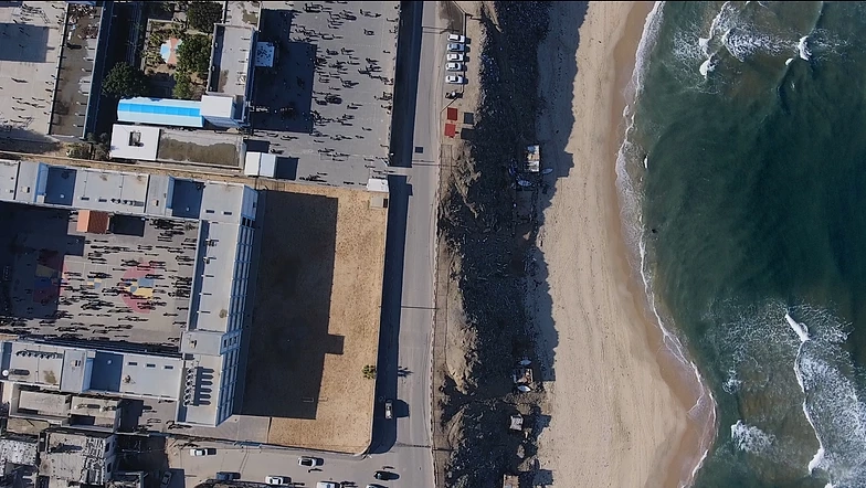 우로보로스의 첫 장면은 드론으로 촬영한 해안가의 풍경이다. 수직으로 내려다본 해안에는 파도가 밀려온다. 아니, 밀려나간다고 표현해야 정확할 텐데, 영상은 이 풍경을 거꾸로 재생시키고 있기 때문이다. 드론은 천천히 해안 도시 안쪽으로 이동하며 도로 위에서 움직이는 차들, 학교처럼 보이는 건물의 운동장에 모여 움직이는 사람들과 같은 도시의 미시적인 움직임들을 마치 감시자와 같은 시선으로 포획하고, 드문드문 부서지고 타버린 건물들을 무심히 스쳐 보여준다. 이 시퀀스 내내 위기감을 고조시키는 허디거디(hurdy-gurdy)의 사운드가 귀에 거슬릴 정도로 강하게 이어진다. 그리고 갑자기 전환되는 장면은 평화롭고 아름다운 해안 도시의 풍경을 천천히 조망한다. 갑자기 왜 다른 도시를 보여줄까 싶지만, 문득 한 건물에 적혀 있는 ‘Bank of Palestine’이라는 문구가 보이고 이곳이 시점만 바꿔 촬영된 가자 지구임을 상기시킨다. 우리가 미디어를 통해 기억하는 가자의 이미지는 재난과 폭력, 절망과 슬픔만이 가득한 도시이지만, 중년의 아랍 여인이 햇살 가득한 정원을 가로질러 들어간 드넓은 가정집은 삶의 시간이 고스란히 남아 있는 부유한 생활을 드러낸다. 카메라는 모든 방을 하나하나 들어가 침구류며 책꽂이, 장식품 등을 손으로 건드리는 여인의 뒷모습을 따라가는데, 이 롱테이크 시퀀스는 해안의 풍경과 마찬가지로 거꾸로 재생된다. 거꾸로 재생되는 시퀀스는 사막에서 텐트를 짓는(해체하는) 네 남녀의 모습이나 마테라의 집 안에서 음식을 준비해서 먹는 주인공의 모습 등 영화 곳곳에서 등장한다. 이는 서사가 선형적 시간의 연속체로서 구조화되는 것을 거부하며 한 단위의 공간이 다른 단위와 임의적으로 연결될 수 있음을 알린다.