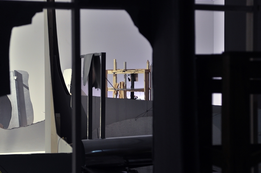 In the vacuum-like state without a single narrative, the artist-made mechanisms and completely ambiguous objects (and images) stir up a feeling of unrest in the viewer, which isn’t like a psychological anxiety nor unstable physical sensation of riding an amusement park ride. Then what is this feeling of unrest or uncanniness? There is too much information in the exhibition to be singularly perceived or described. Besides the elements mentioned above, it’s difficult to describe the sense of beauty in the woodcut up in all directions, steel structures that are complexly grafted together, and the piles of electric lines that are tangled up for no apparent reason. To apprehend everything in the exhibition, this place would demand an almost infinite amount of time. Therefore, the proper name ‘Gomyomsom’ can only be arbitrarily fixed as ‘this and that’. However, what characterizes Gomyomsom is that the unselected is not removed and remains undoubtedly as ‘something there’. Something which undoubtedly exists can remain and be recognized as a possible world, probably because the simple, plain and sealed virtual world, which the narrative introduces, has been broken down. In other words, all sorts of things without hierarchy fill Gomyomsom, and if there were to be a hierarchy, it would only be imposed upon by the viewer. Ultimately, anxiety might be another term for the pressure to make completely independent decisions in a place where all possibilities are conditioned to be displayed in full at once. More precisely, however, the uncanniness is a result of the incarnation of things that still remain visible (without disappearing) even after the decision. The sensation of the sound and movement being repetitive — which are actually reverberating unstably in very subtle dimension and thus include countless perpetuation — is related to this feelings of unrest in the sense that they are never converged into one system. Because the pressure for decision given to the audience is quite strong in Gomyomsom (the audience also has the right to not decide on anything in the exhibition), it does not impose one singular reflection upon the audience. I think that all processes themselves in Gomyomsom are one metaphor, and what it alludes to is not fiction but the very way in which such fiction is created.