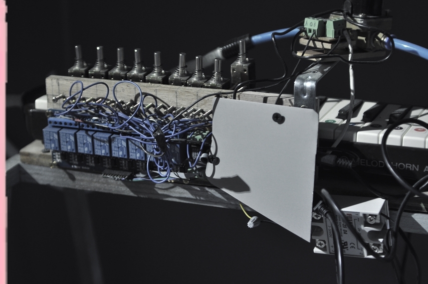 There’s a strange sense of time in the gallery. (Several) strange indescribable sounds can be heard in (a few) indefinite places that are difficult to locate. These sounds are created by mechanism-objects located throughout the exhibition space. The hand-sized device on Display has thin copper wires drooped down like the legs of a grasshopper, and these legs rise up in a fixed interval of time, then drop down. The vibration of a small motor the size of a finger which seems to have come out of a children’s toy, and the friction sound of metal are heard also on a fixed interval. In Where Concrete Stones Count, metal scaffold is cut into shorter pieces and tangled up, and concrete lumps slightly larger than fist are randomly scattered around it. A plastic scale capable of counting up to 6 digit numbers on their own is embedded into each of the concrete lumps like rock barnacles, all connected with electric wires. The scales, over ten in quantity, are all gathered in one place and produce the same sound, but each scale produces in its own rhythm and duration. Observing all the numbers expressed in 6 digits and discovering the common law of the numbers in a group is almost a humanly impossible task. Observing all the scales count up to all six digits would take 278 hours, given that the observer counts one number per second. But even then, the actual number counts slower than in seconds. The audience can only experience the time segmented by the scales and the overlapping of such segments of time.
