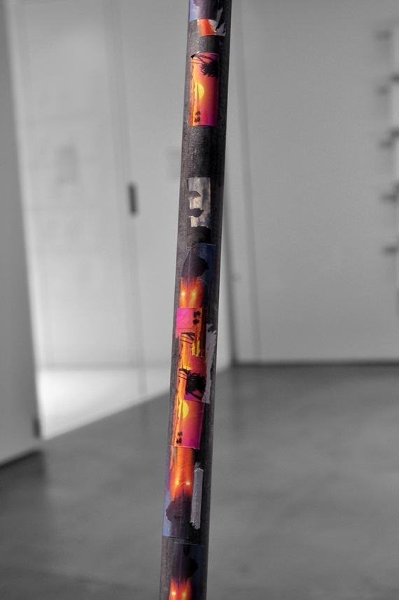 Such errors were possible in Zorn’s Lemma because the film, consisting of a series of frames, was used as the basic elements of the work. In the same way, such errors are possible in Gomyomsom because all moving mechanisms were made unstable, directly through the ‘hands’. If the imprecise boundary is a type of error, it in turn demonstrates the scope of firm and stable system. In this perspective, it’s evident that Gomyomsom is not only just about filling the space where narrative has been removed with operations of devices that continue malfunctions. There are a few elements that remain as questions, and one of them would be that images with almost no information are put into the exhibition space. Upon closer inspection of The Big, in which two long scaffolds are connected like a stand with its legs open, it’s covered with kitschy stickers of cliché illustrations of sunset ocean views and 3D modeling of automobiles. This is a part of the image in the work Quarrel, in which small rectangular mirrors, imprecisely cut by hand, are plastered (with irregular gaps) onto the mirror ball. On the rectangular mirrors in Quarrel, countless images are cut accordingly in size and meticulously glued to each mirror. Other than the kitschy images mentioned above, there are also unidentifiable images captured by surveillance cameras and images of emoticons (made by the artist himself) used in smartphone messages. Although the same types were used many times, it’s difficult to tell what rules they follow, and they hover in their own directions without any standards. There is a loop on one vertex of the mirror ball, and it’s connected to a small motor which makes it move periodically. While it’s supposed to move in a circle, the plank on which the motor is affixed disturbs this movement and makes it move slightly to left and right. The indistinctive images with unknown sources move here and there (literally) on top of the mirror ball in a very microscopic dimension.